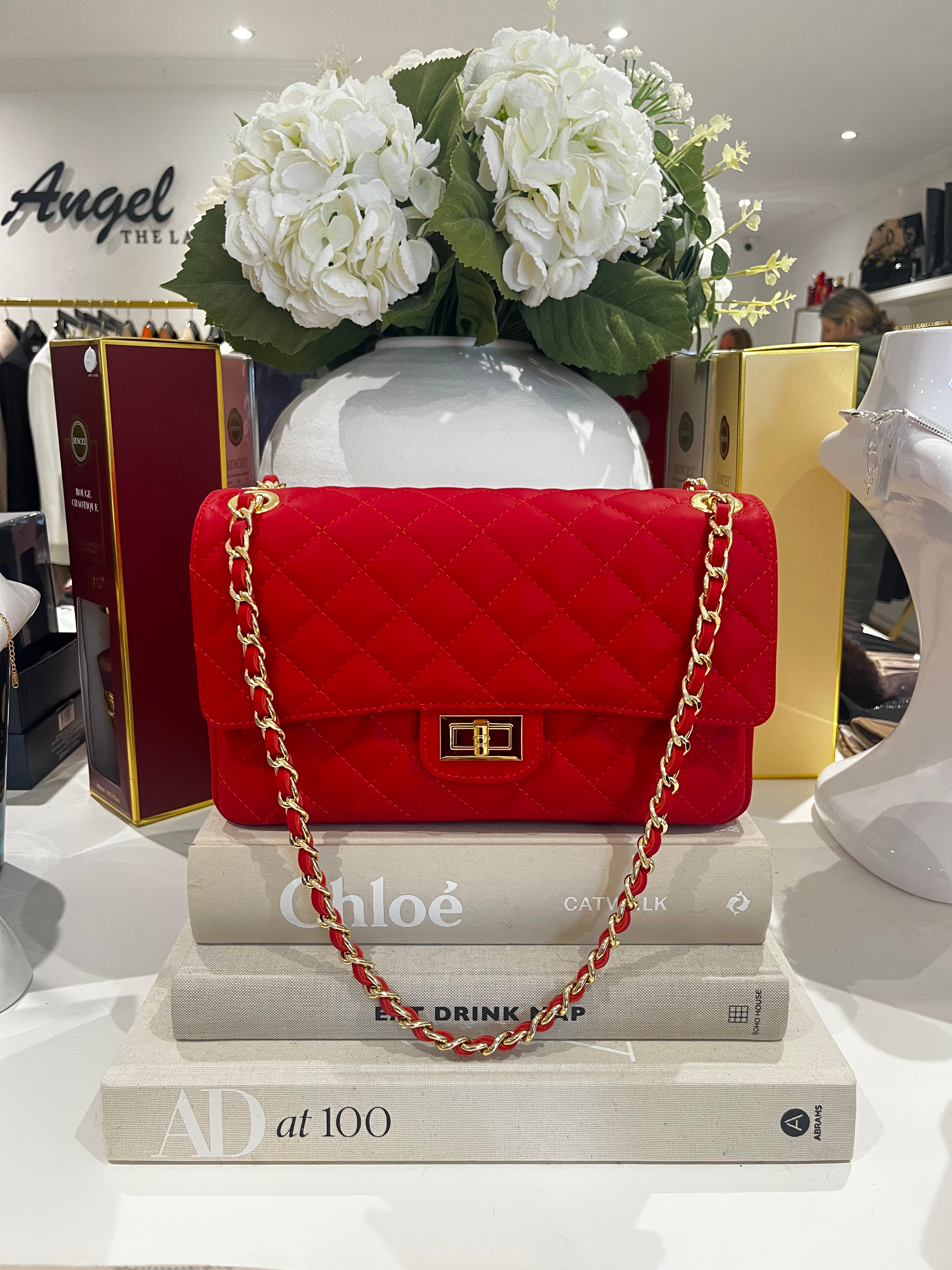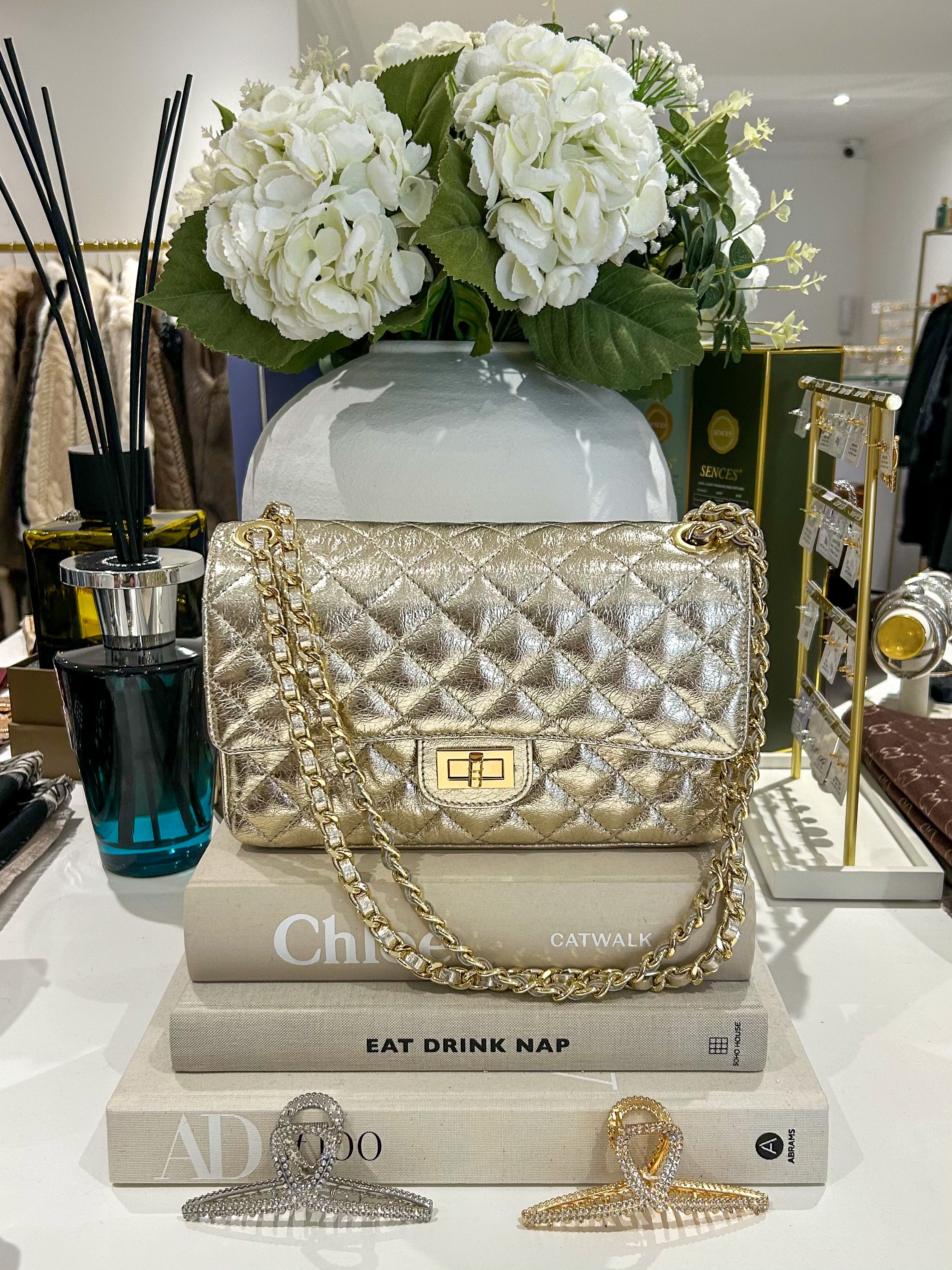 Large Genuine Leather Quilted Turn Lock Chain Handle Handbag (8 Colours)