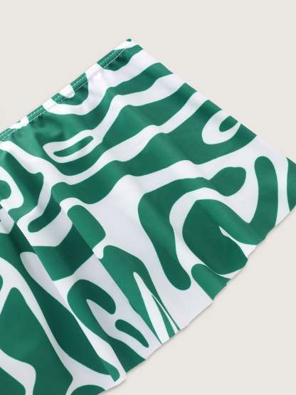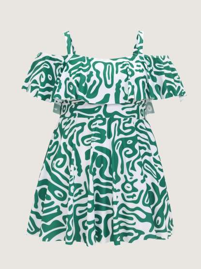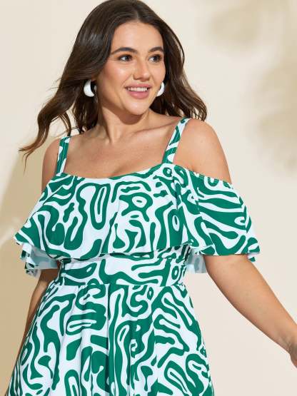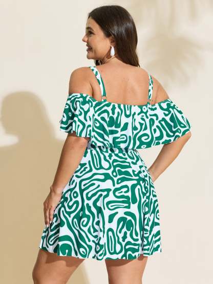 Geometric Print Cold-Shoulder Swim Dress
