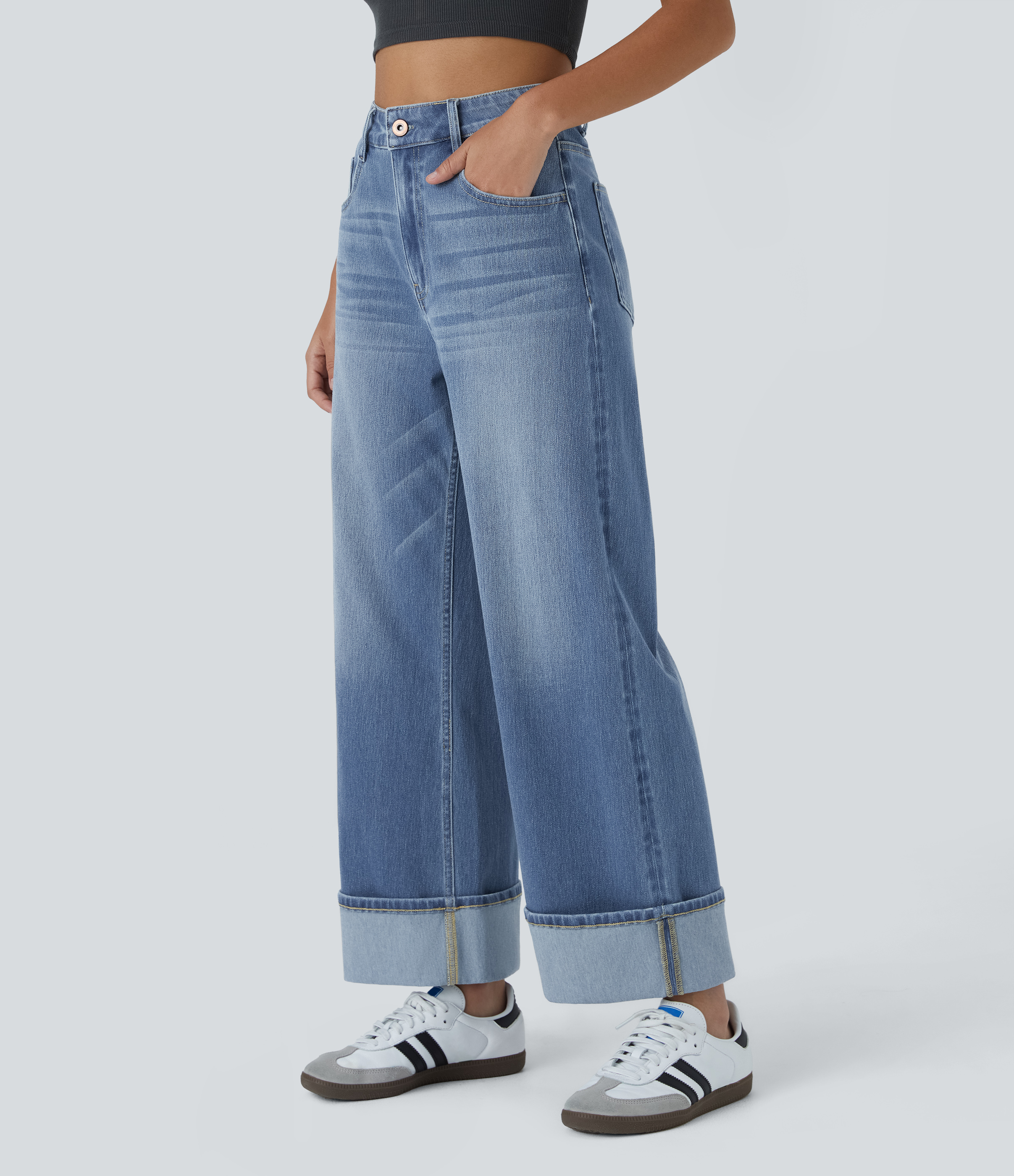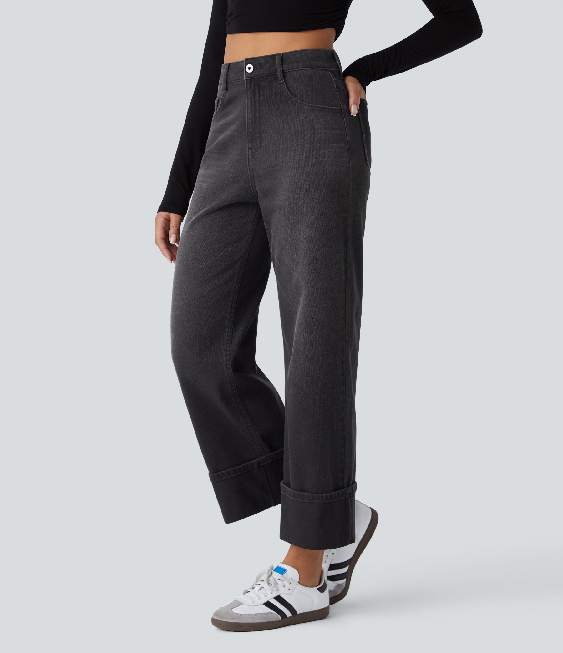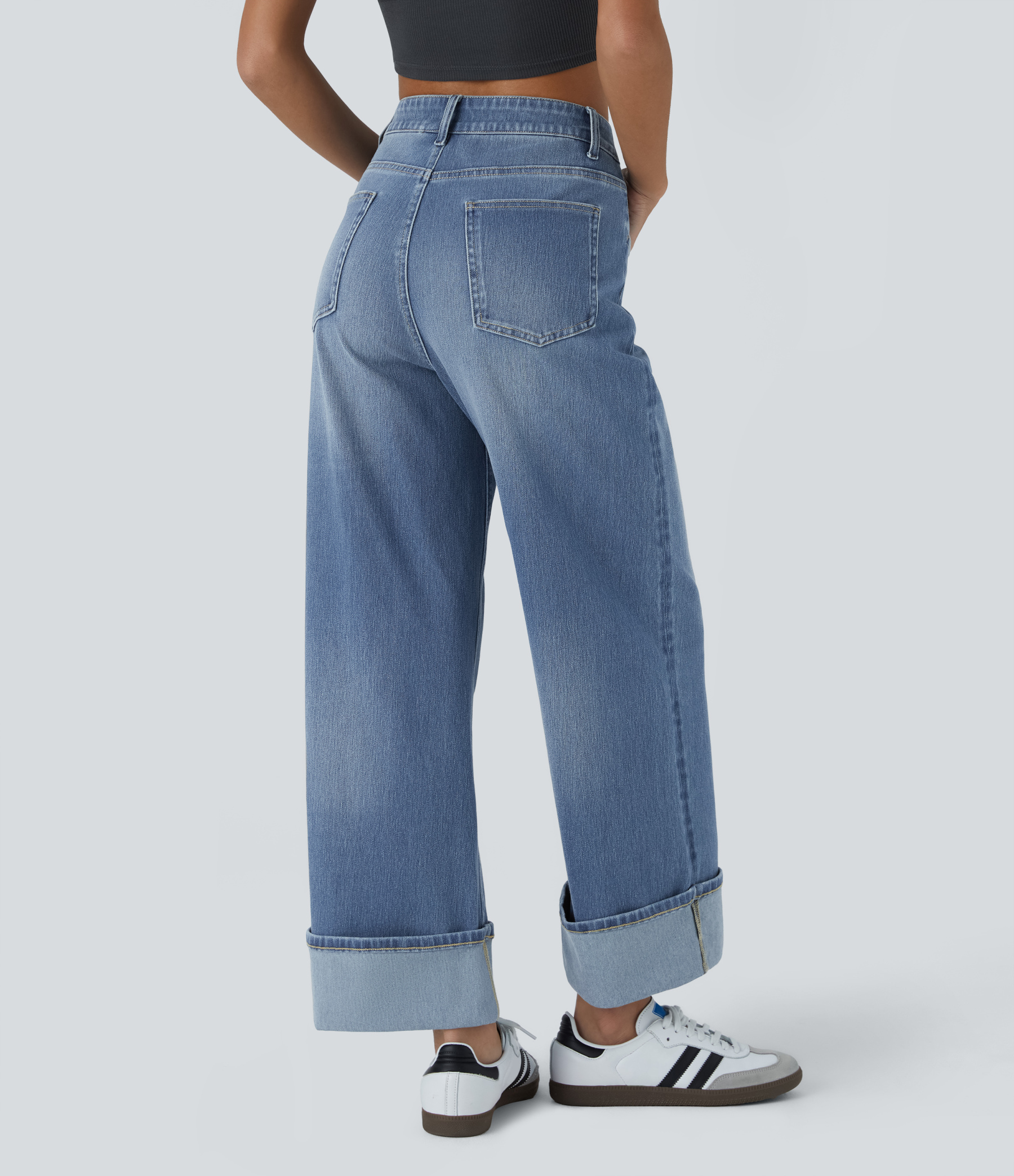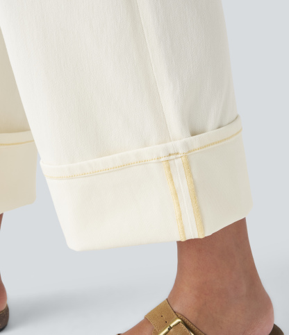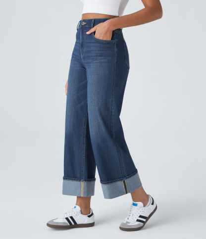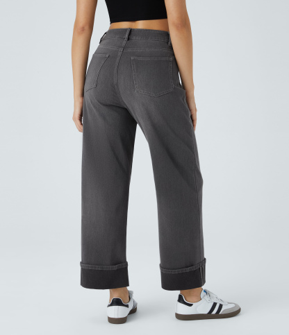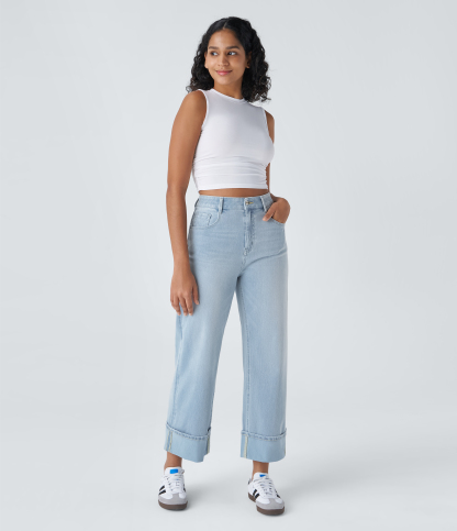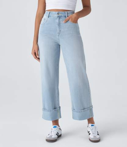 Halara FlexTM High Waisted Multiple Pockets Rolled Hem Wide Leg Washed Stretchy Knit Casual Jeans