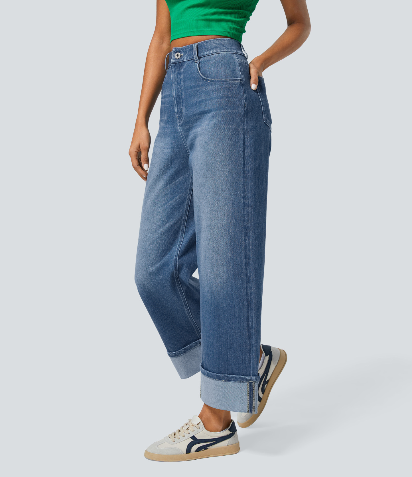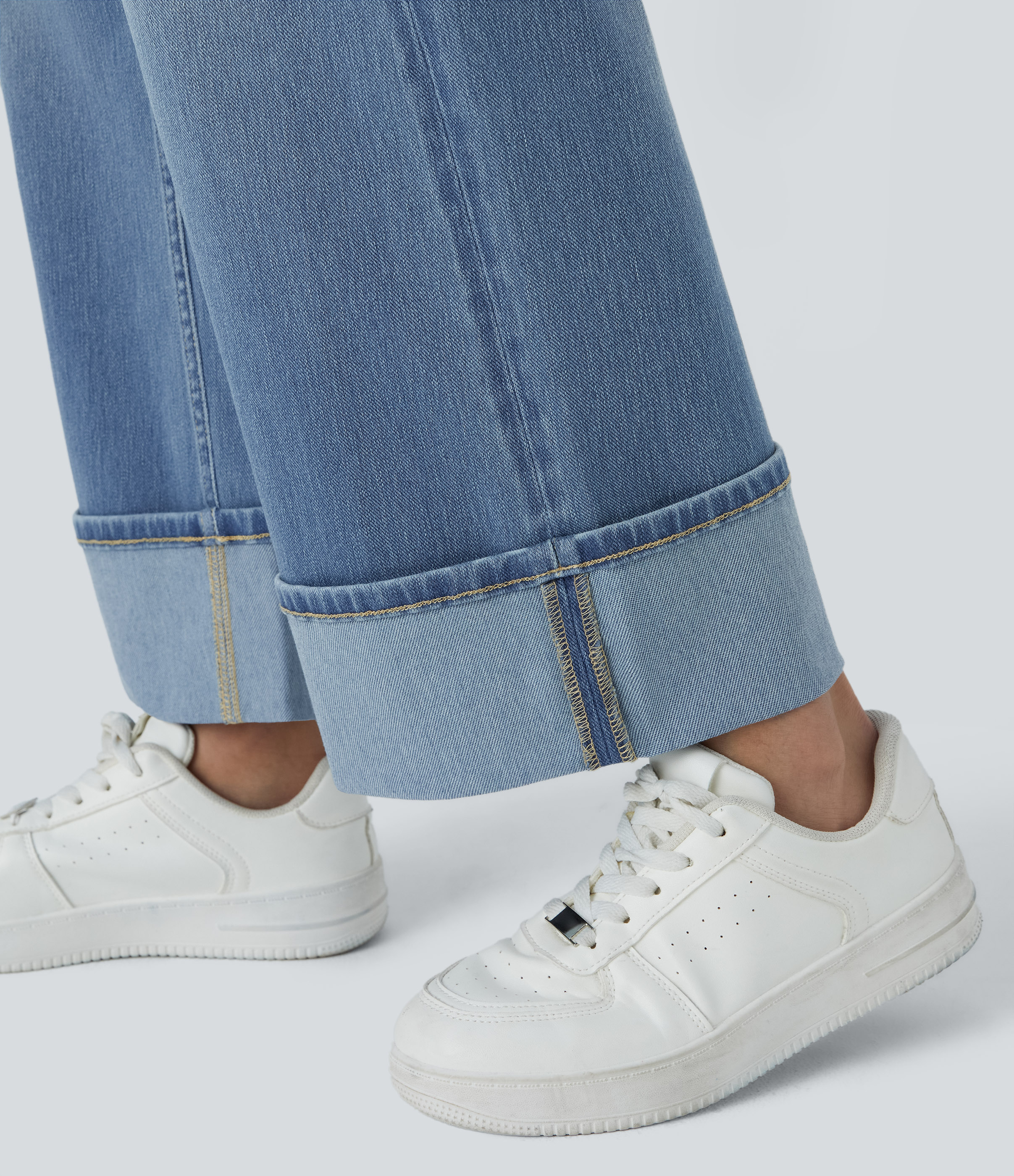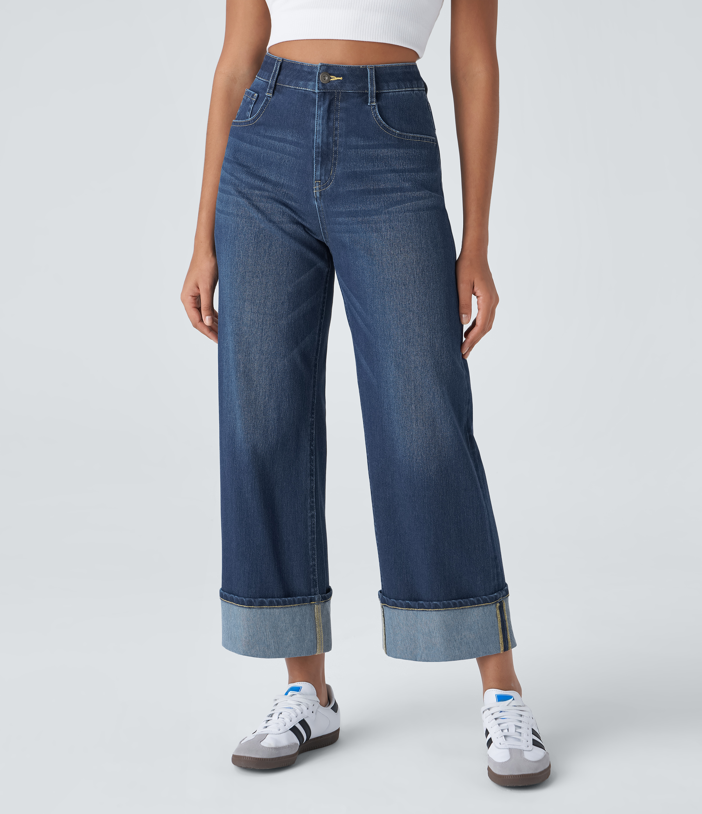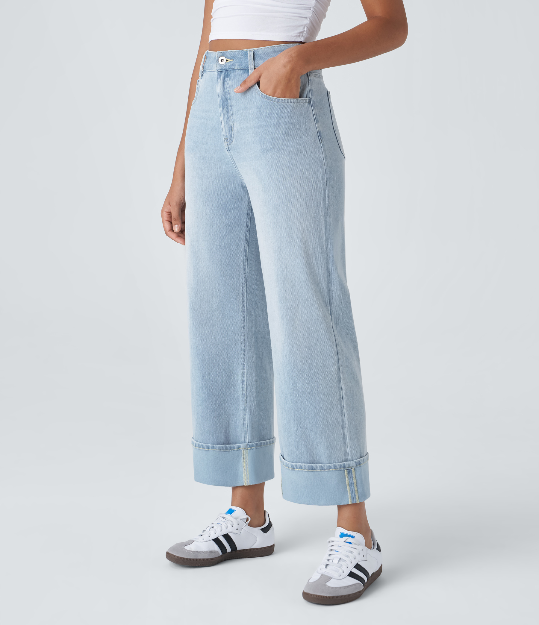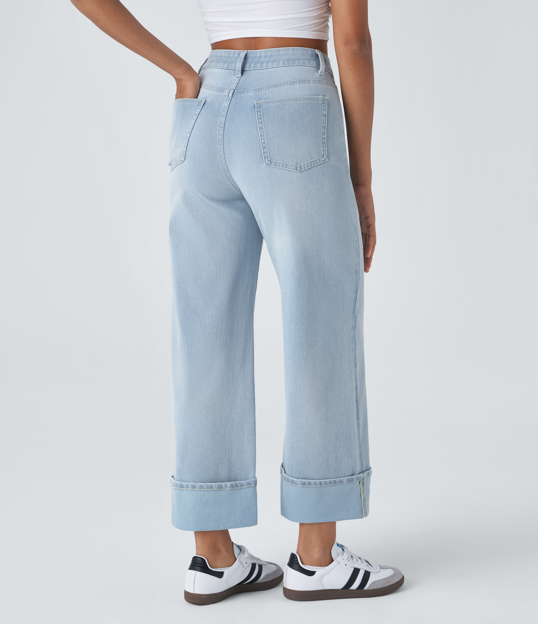 Halara FlexTM High Waisted Multiple Pockets Rolled Hem Wide Leg Washed Stretchy Knit Casual Jeans
