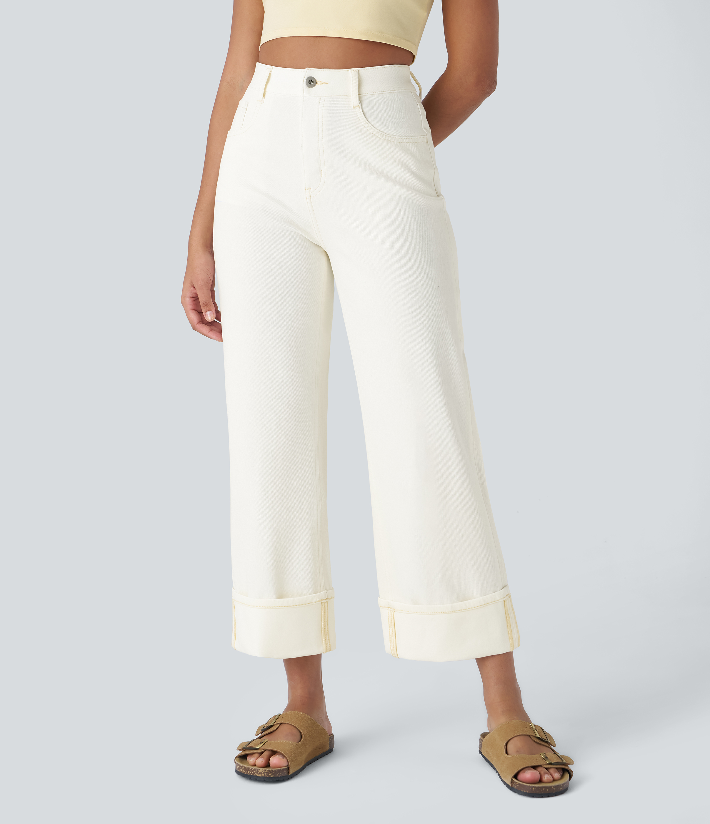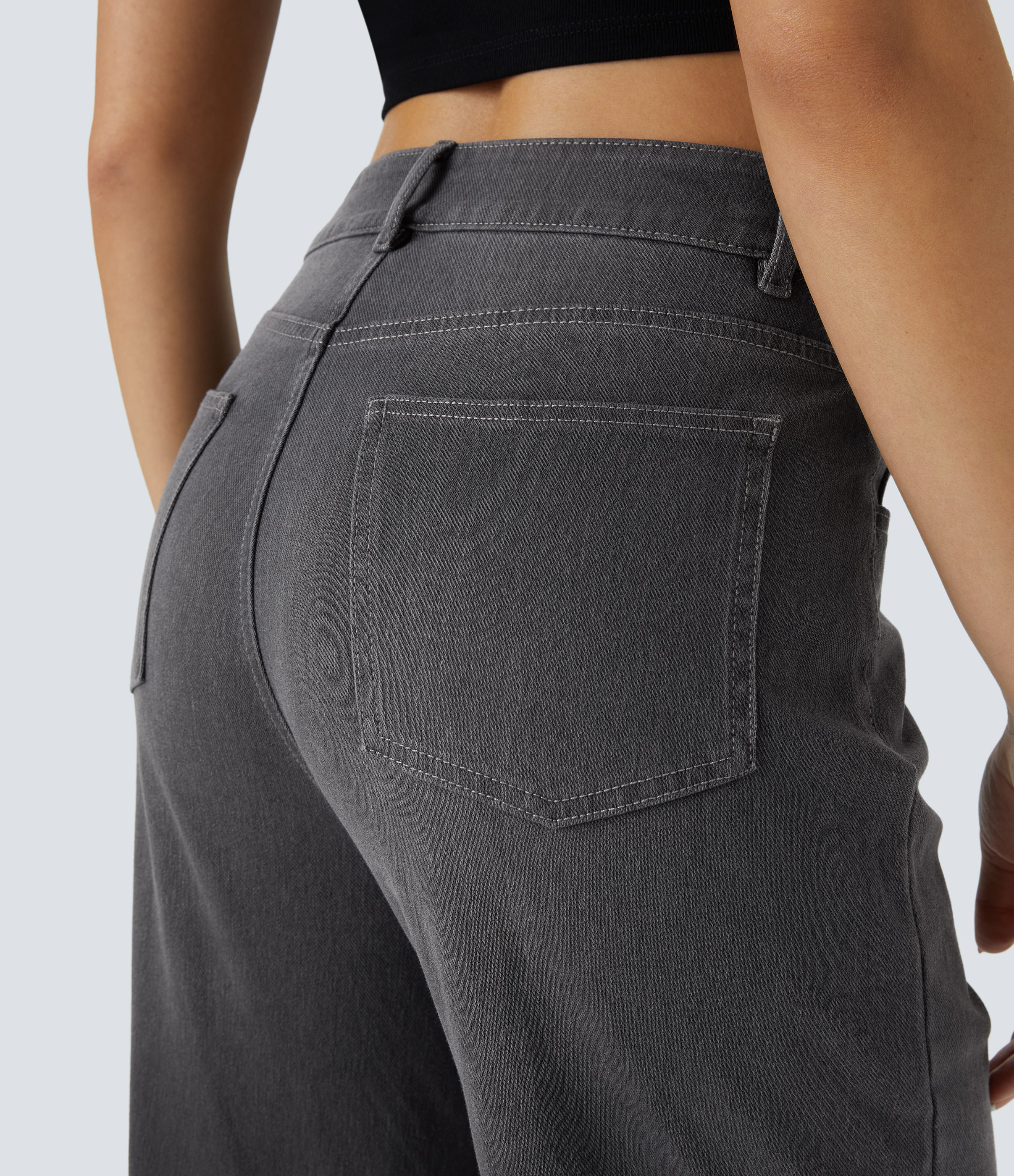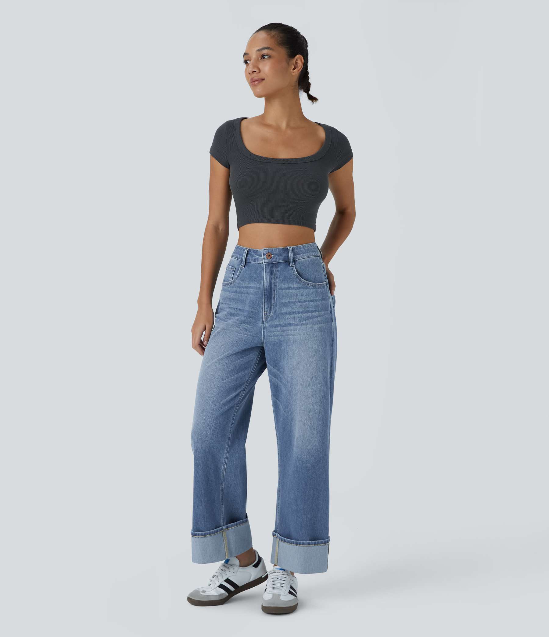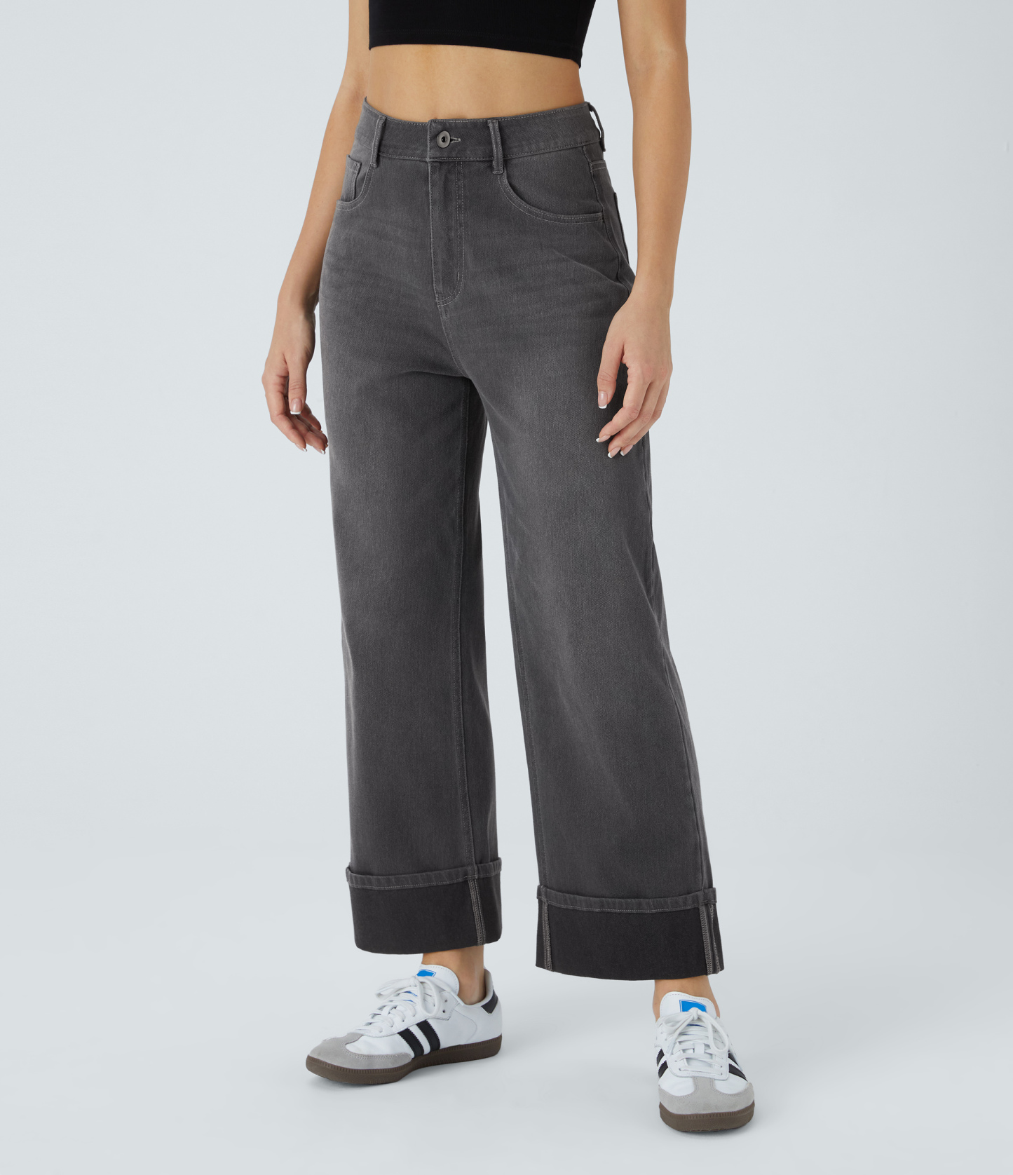 Halara FlexTM High Waisted Multiple Pockets Rolled Hem Wide Leg Washed Stretchy Knit Casual Jeans