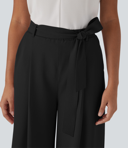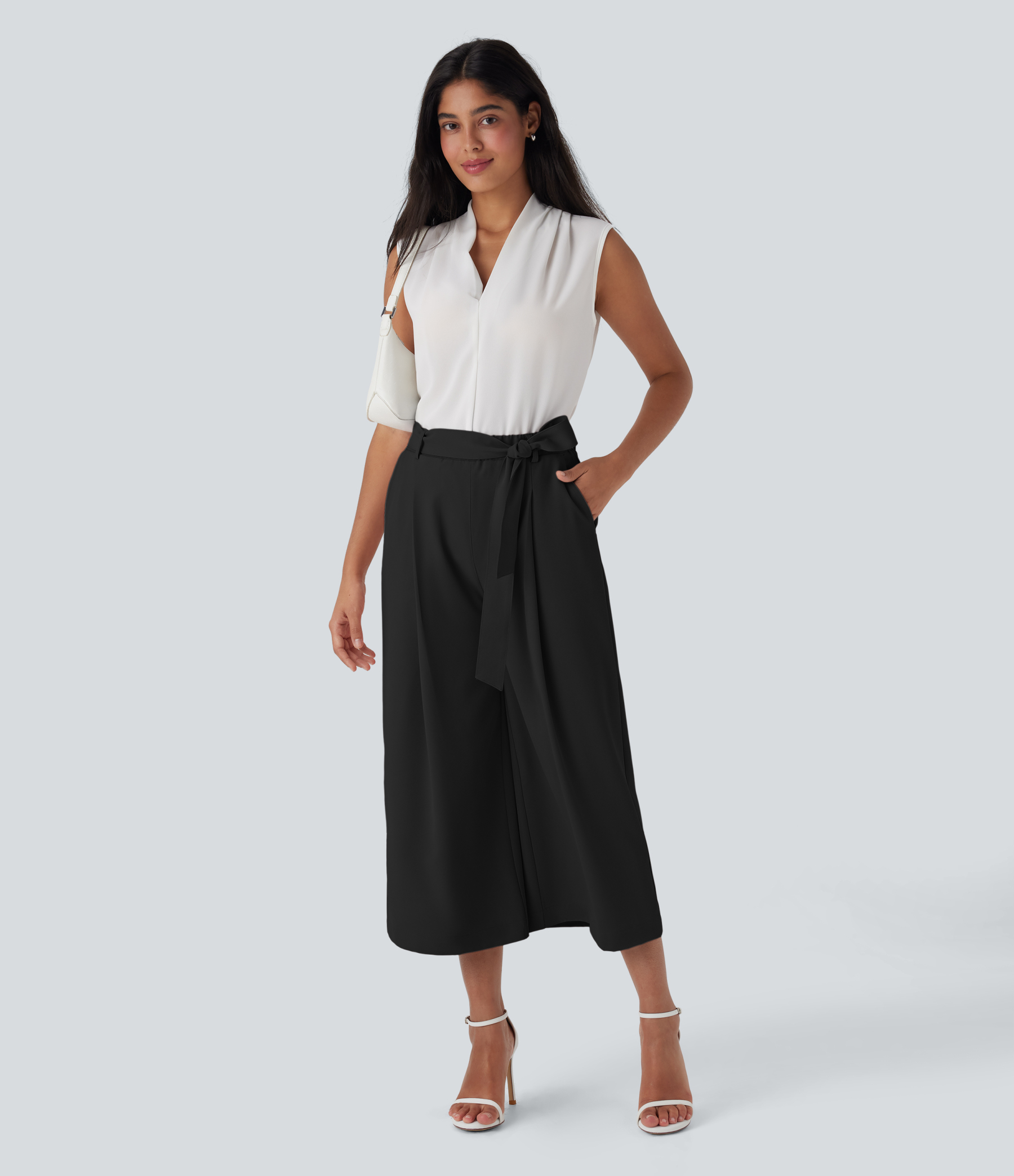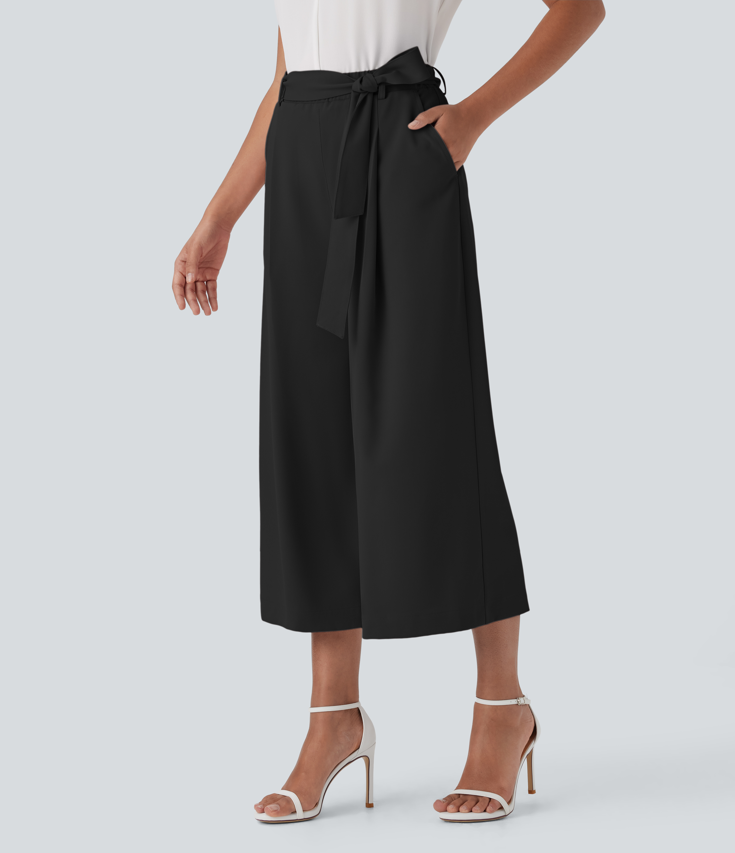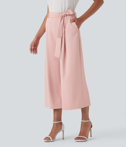 High Waisted Belted Wide Leg Cropped Work Pants with Pockets