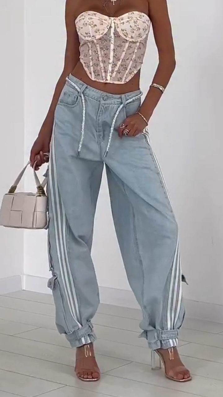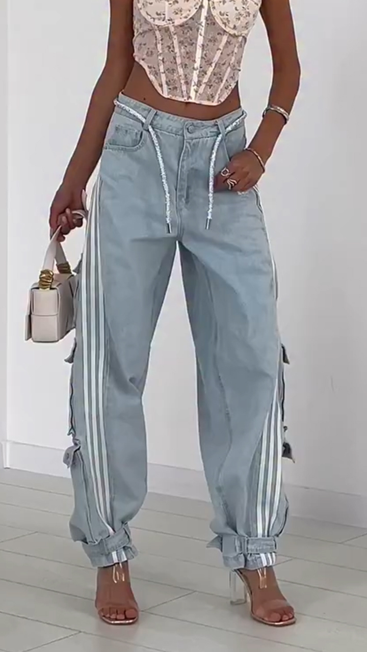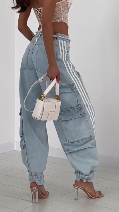Ladies Vertical Pattern Splicing Multi Pocket Casual Pants
