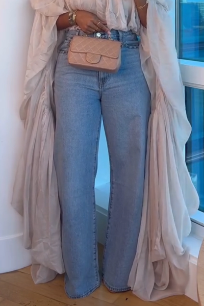 Women Square Collar Long Sleeved Robe Top + Jeans Casual Suit