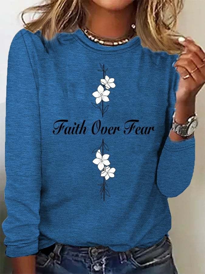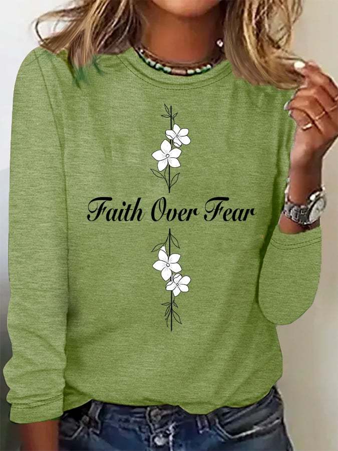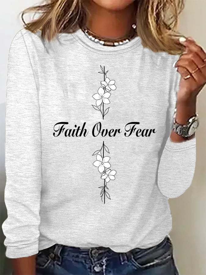 Women's Casual Faith Overcomes Fear Cross Colored Cotton Long-Sleeved T-Shirt
