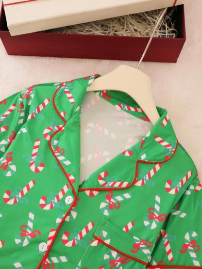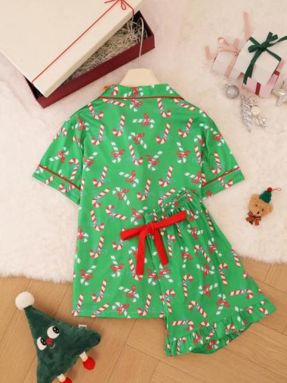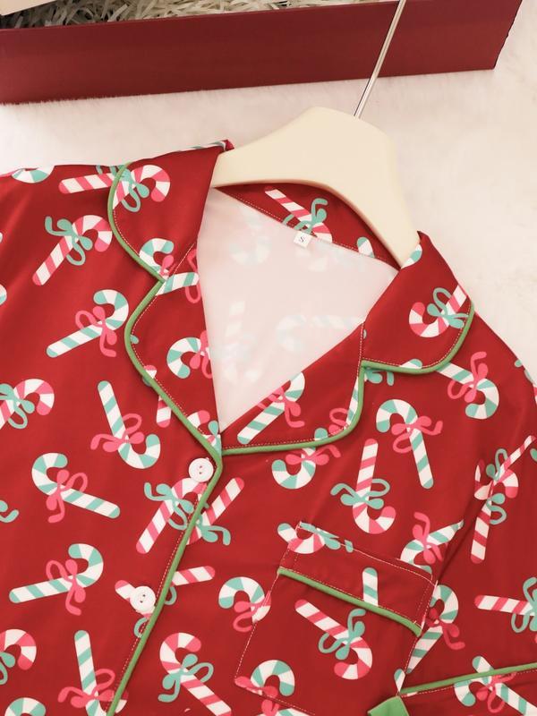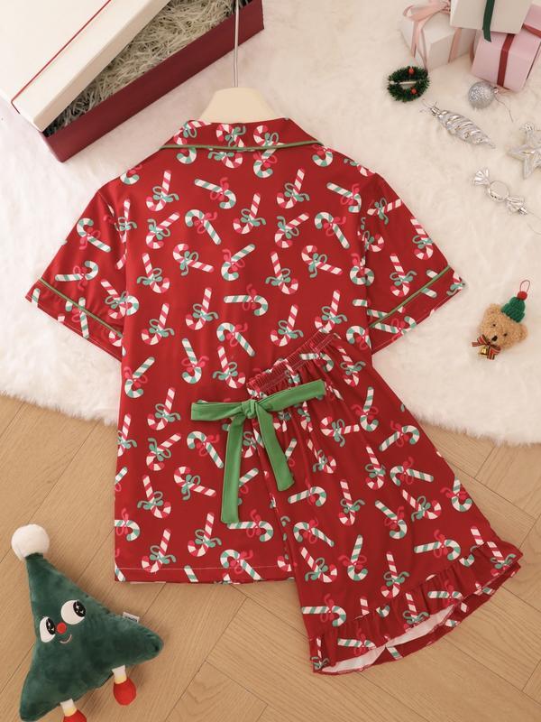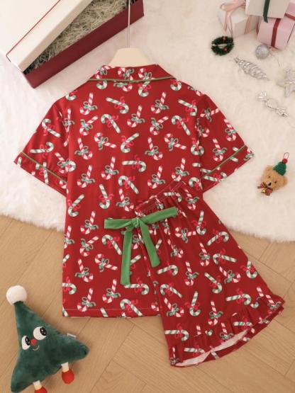 2 pieces of ladies' Christmas cane candy printed short sleeved shorts sleepwear set with buttons, collars, bows, suitable for comfortable and casual home wear in all seasons
