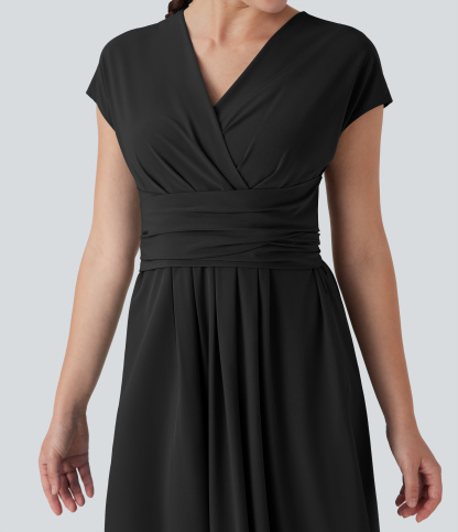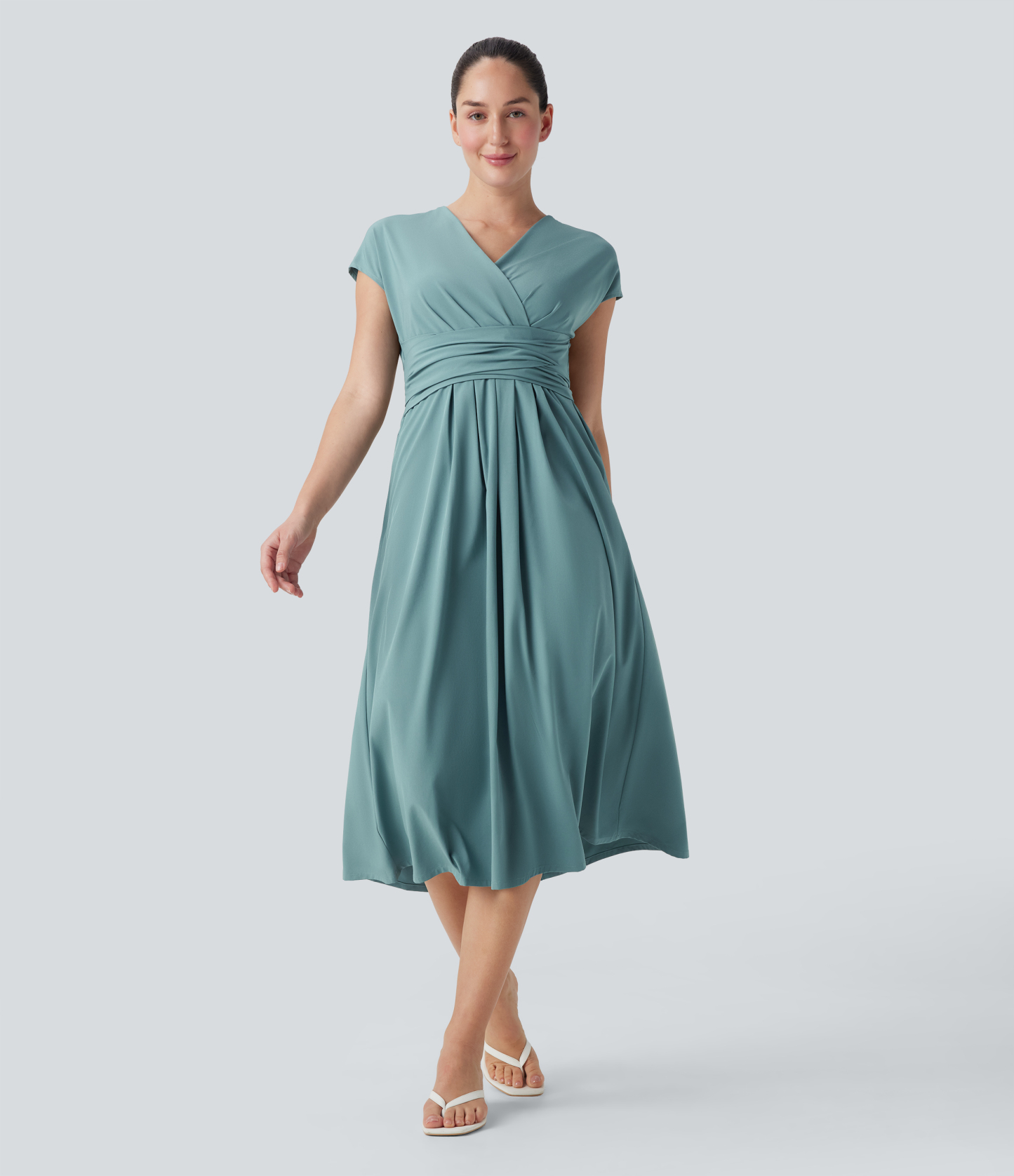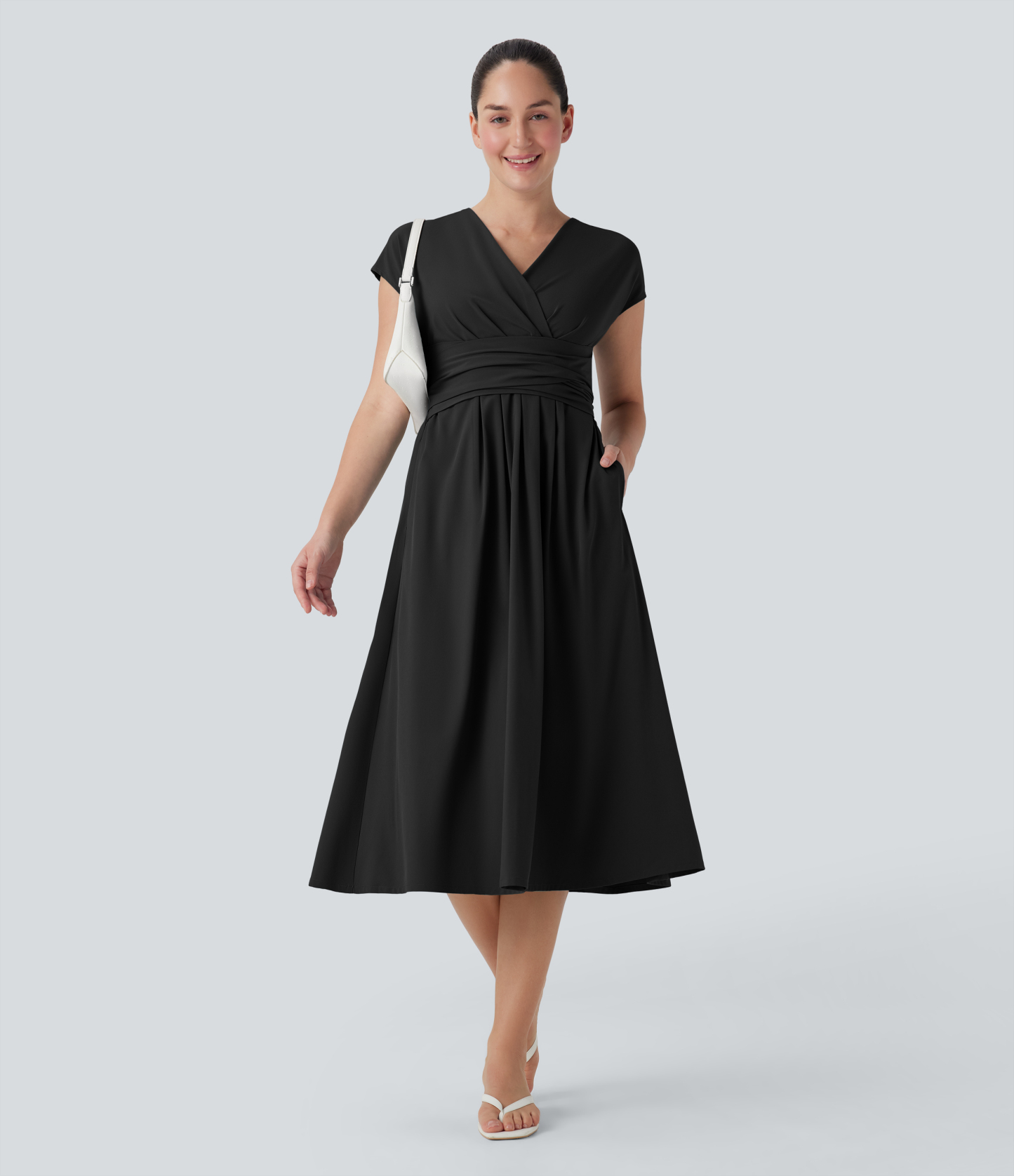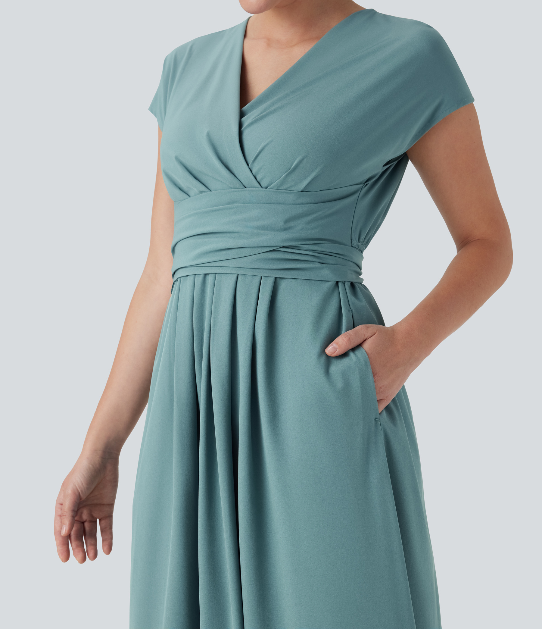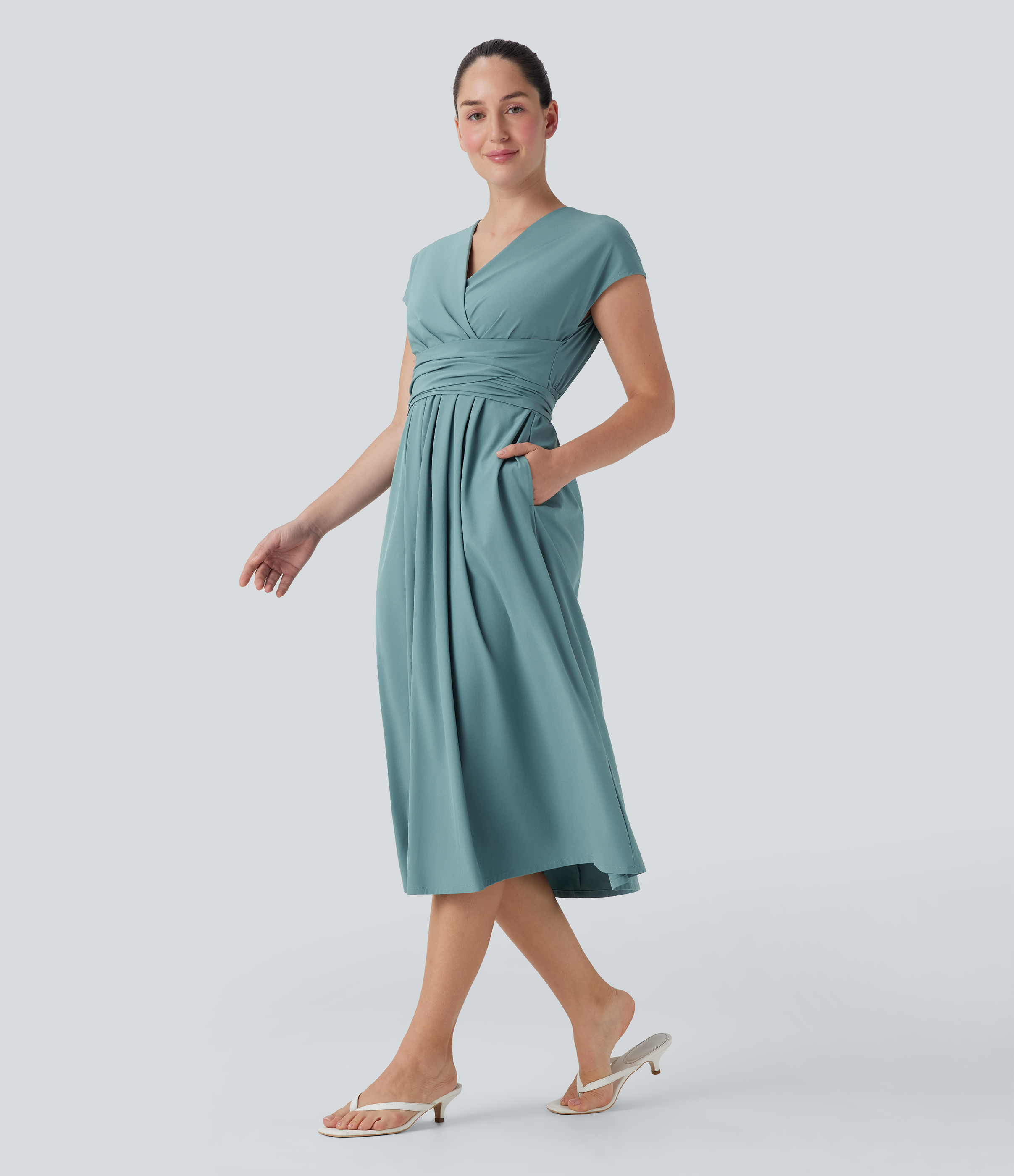 BreezefulTM V Neck Short Sleeve Pocket Tie Back Quick Dry Midi Casual Dress