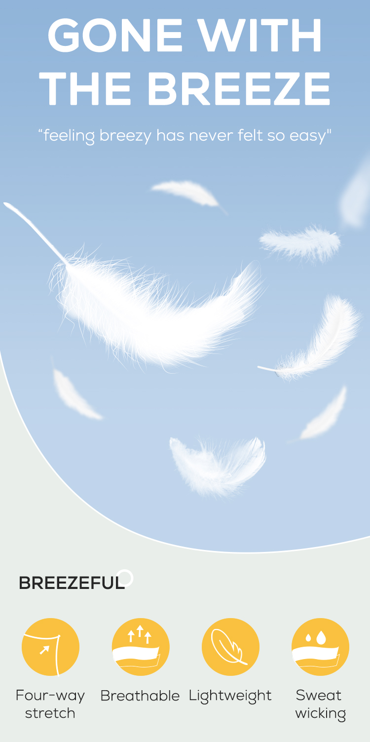 • Breezeful™ is soft to the touch, with 4-way stretch, breathability, and sweat-wicking qualities to keep you dry and comfortable for movement. Lightweight, breathable feel.
