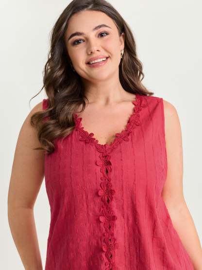 Shop Cotton Floral Lace Detail Textured Tank Top now and redefine your style with confidence at BloomChic. Tailored for mid and plus-size women. This trendy Tops Women, sizes 10-30. Color:Crimson;Style_2:Timeless;Pattern Type:not graphics;Sleeve Type:Sleeveless;Pocket:No-pocket