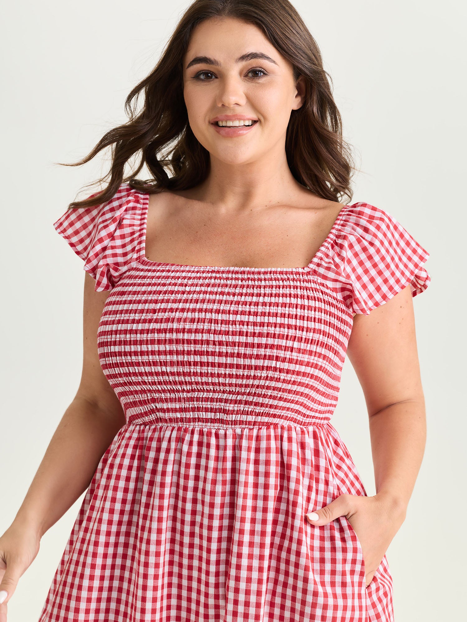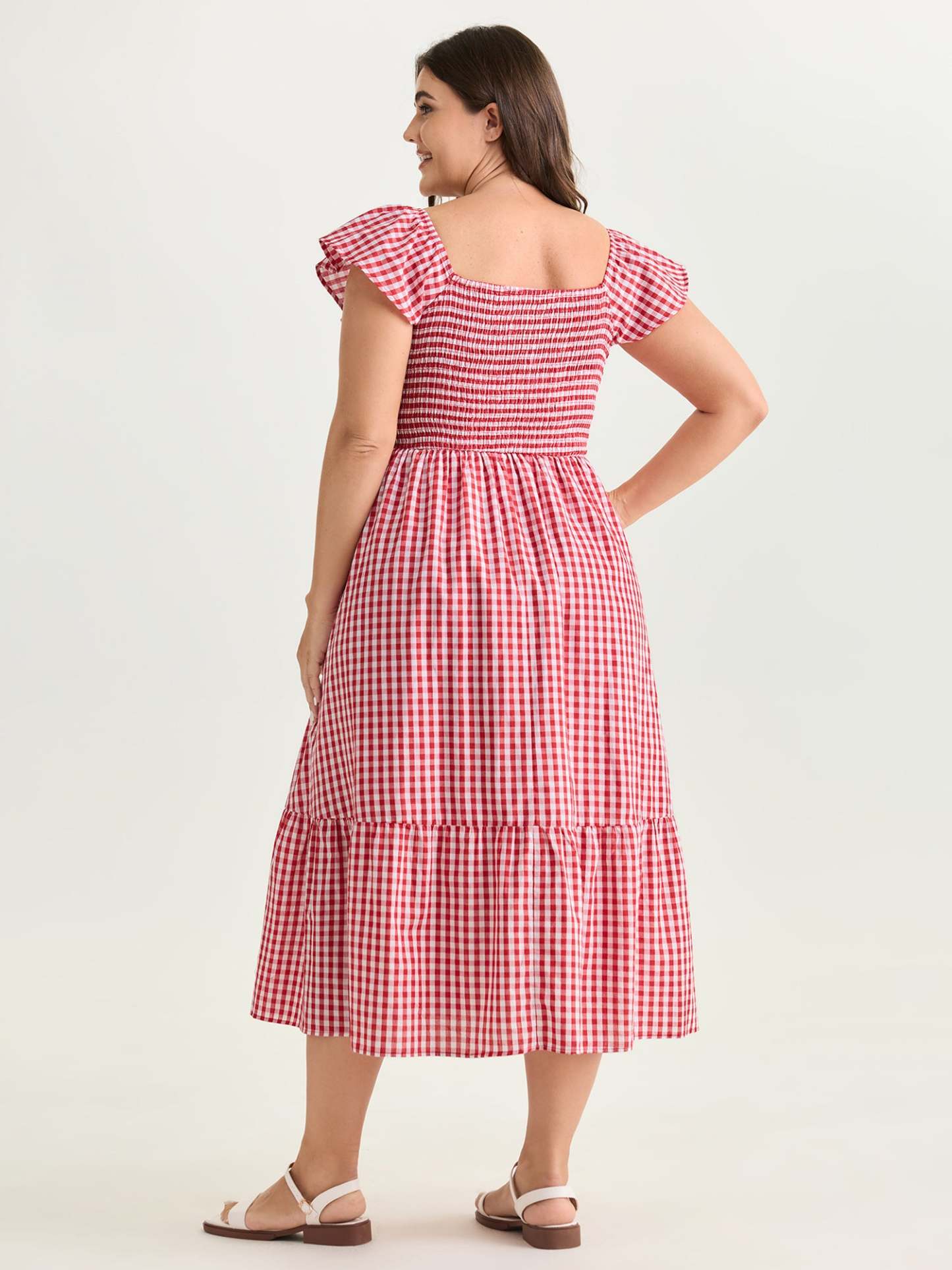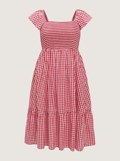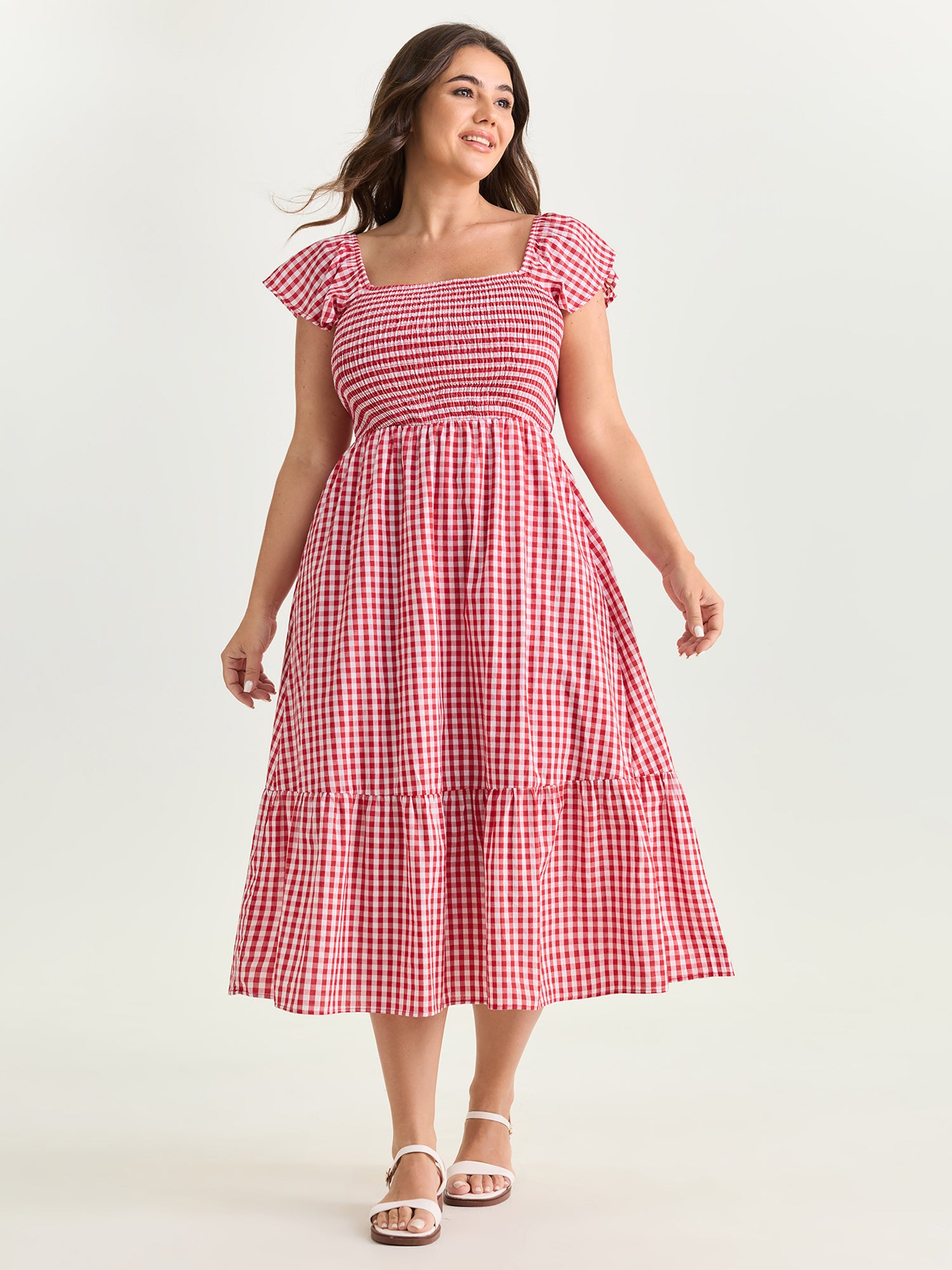 Cotton Gingham Print Shirred Bodice Midi Dress