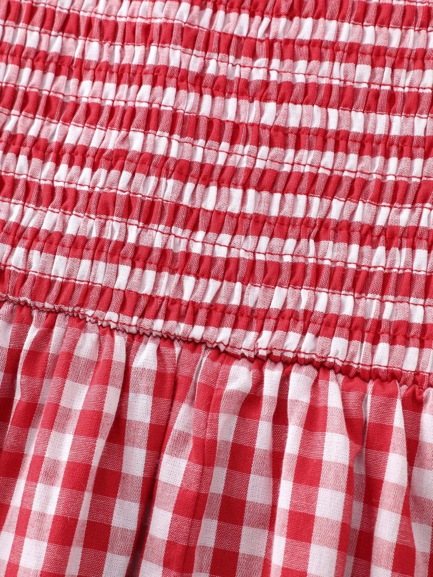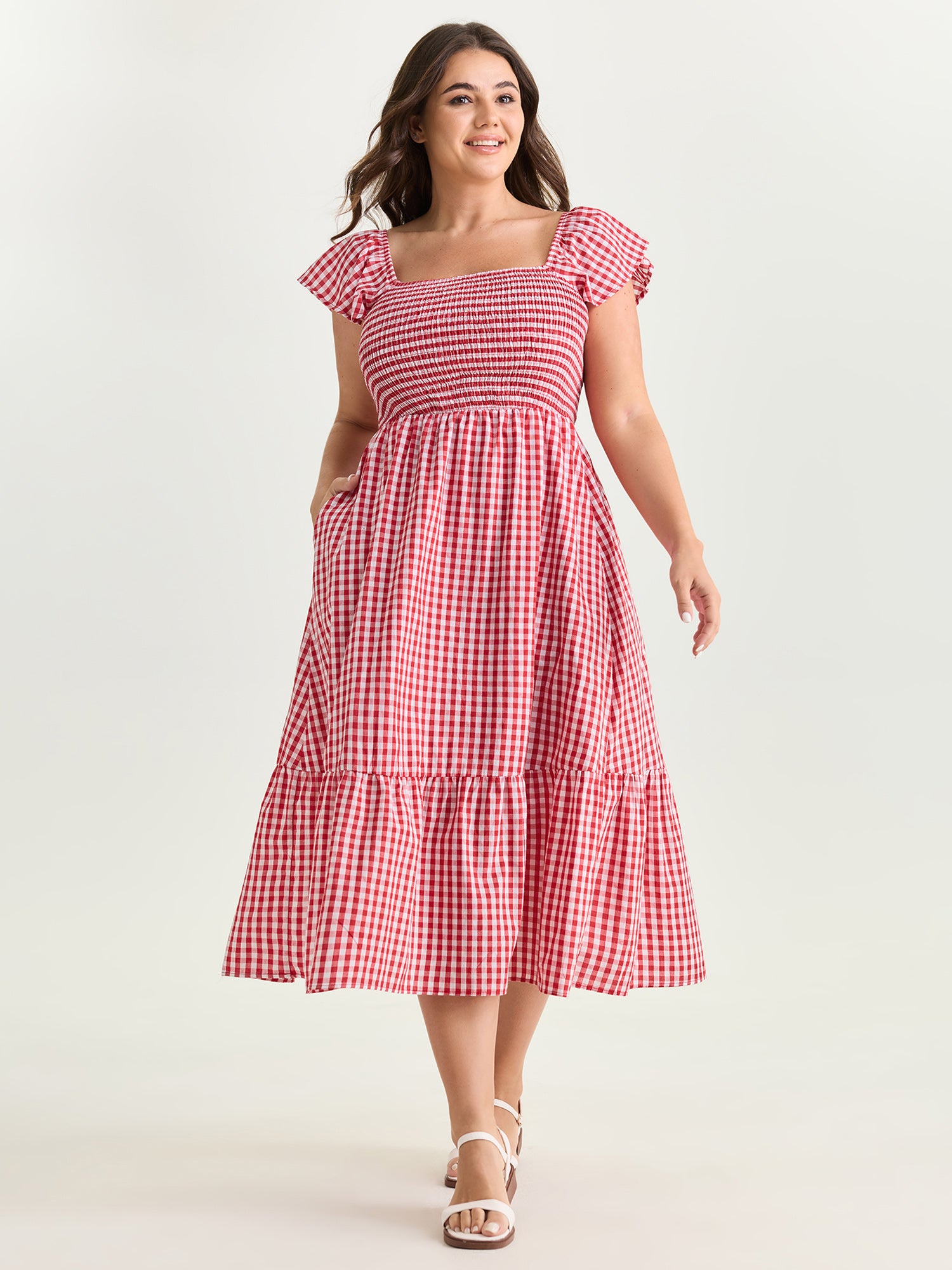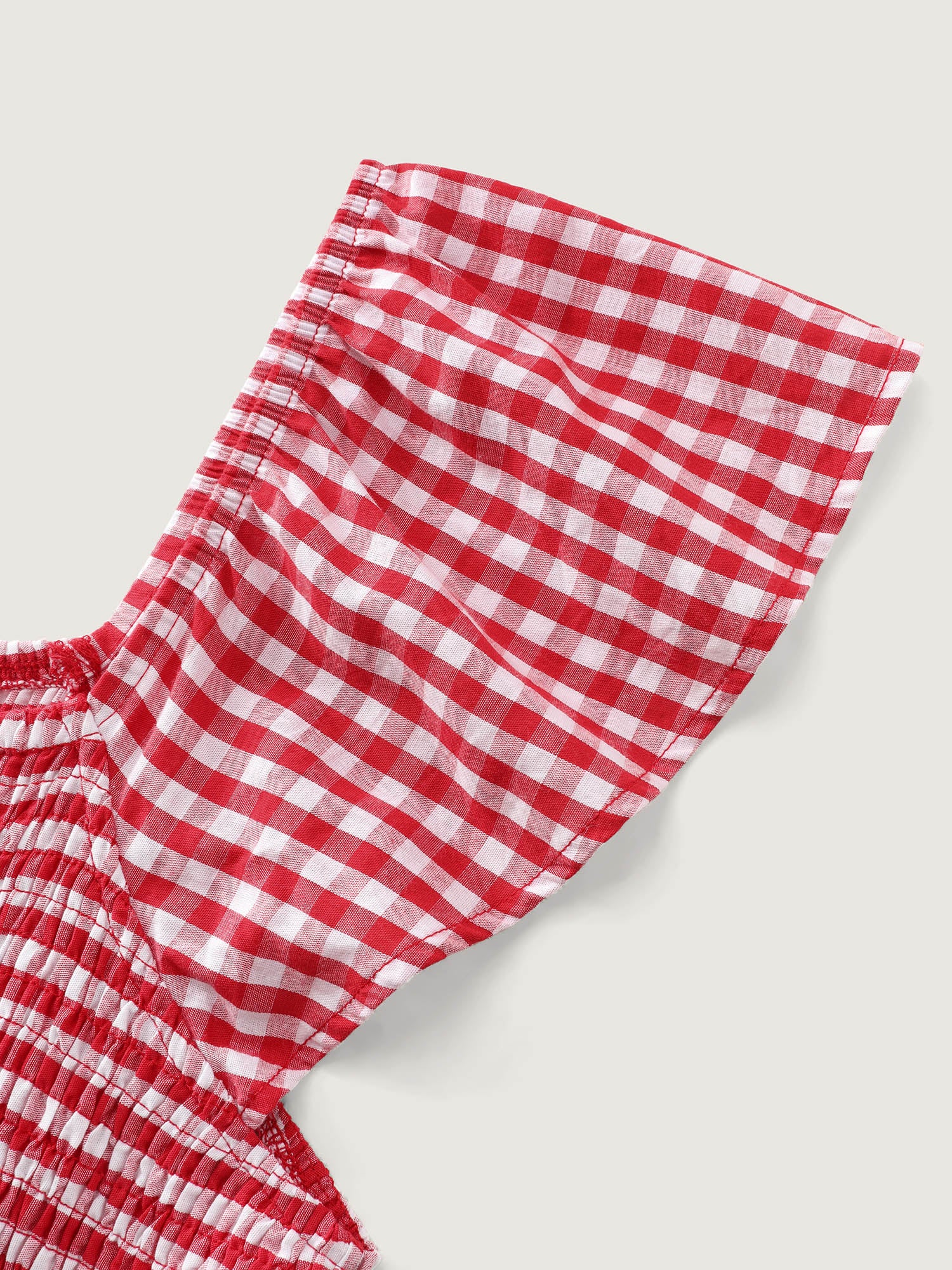 Cotton Gingham Print Shirred Bodice Midi Dress