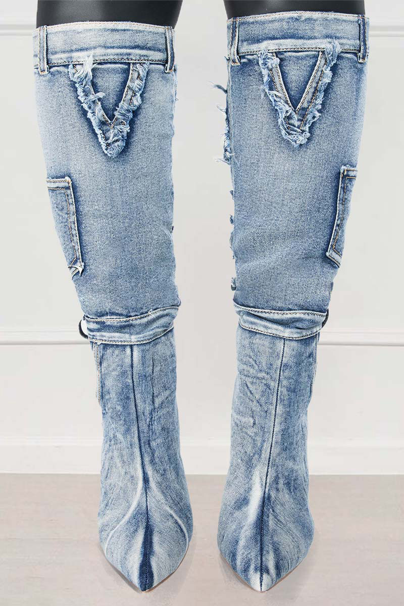 Denim Raw Edge Pointy Toe Stiletto High Leg Boots-Blue