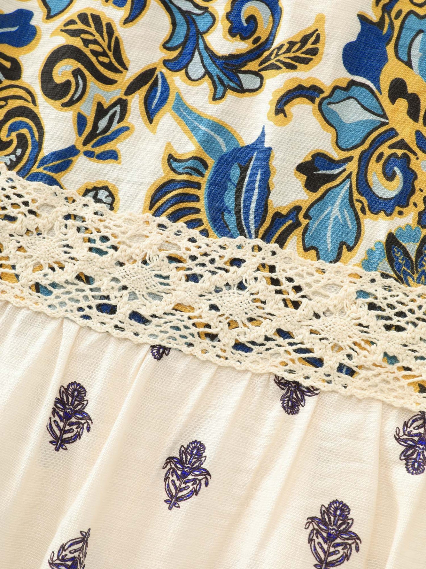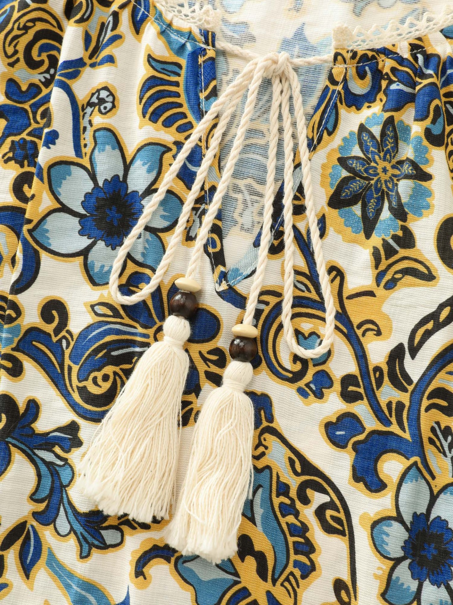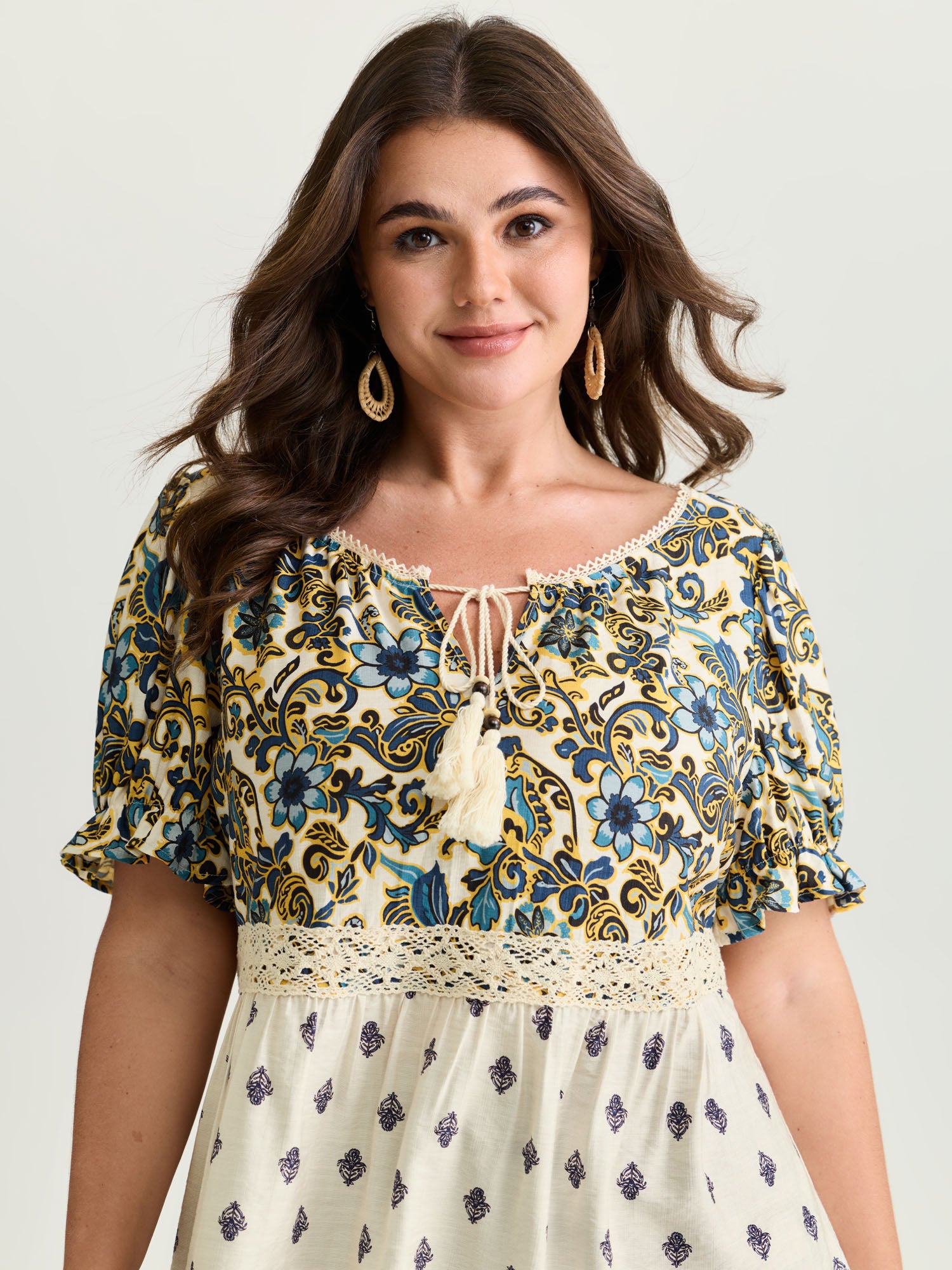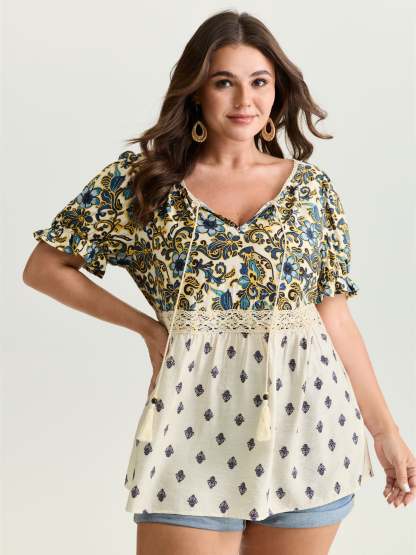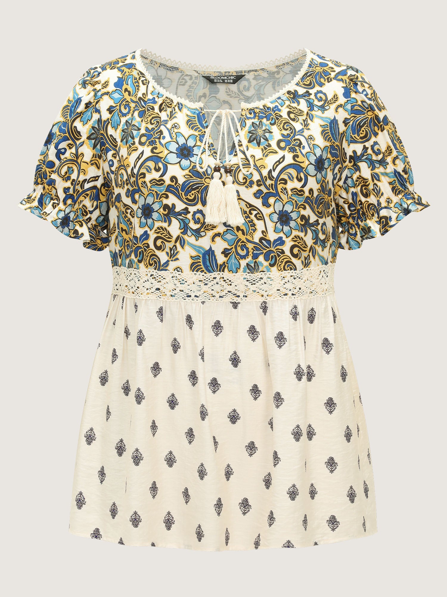 Shop Floral Print Lace Neckline Flowy Blouse now and redefine your style with confidence at BloomChic. Tailored for mid and plus-size women. This trendy Tops Women, sizes 10-30. Color:lvory;Style_2:Boho;Pattern:Ethnic Floral;Sleeve Type:Puff Sleeve;Details:Colorblock;Pocket:No-pocket