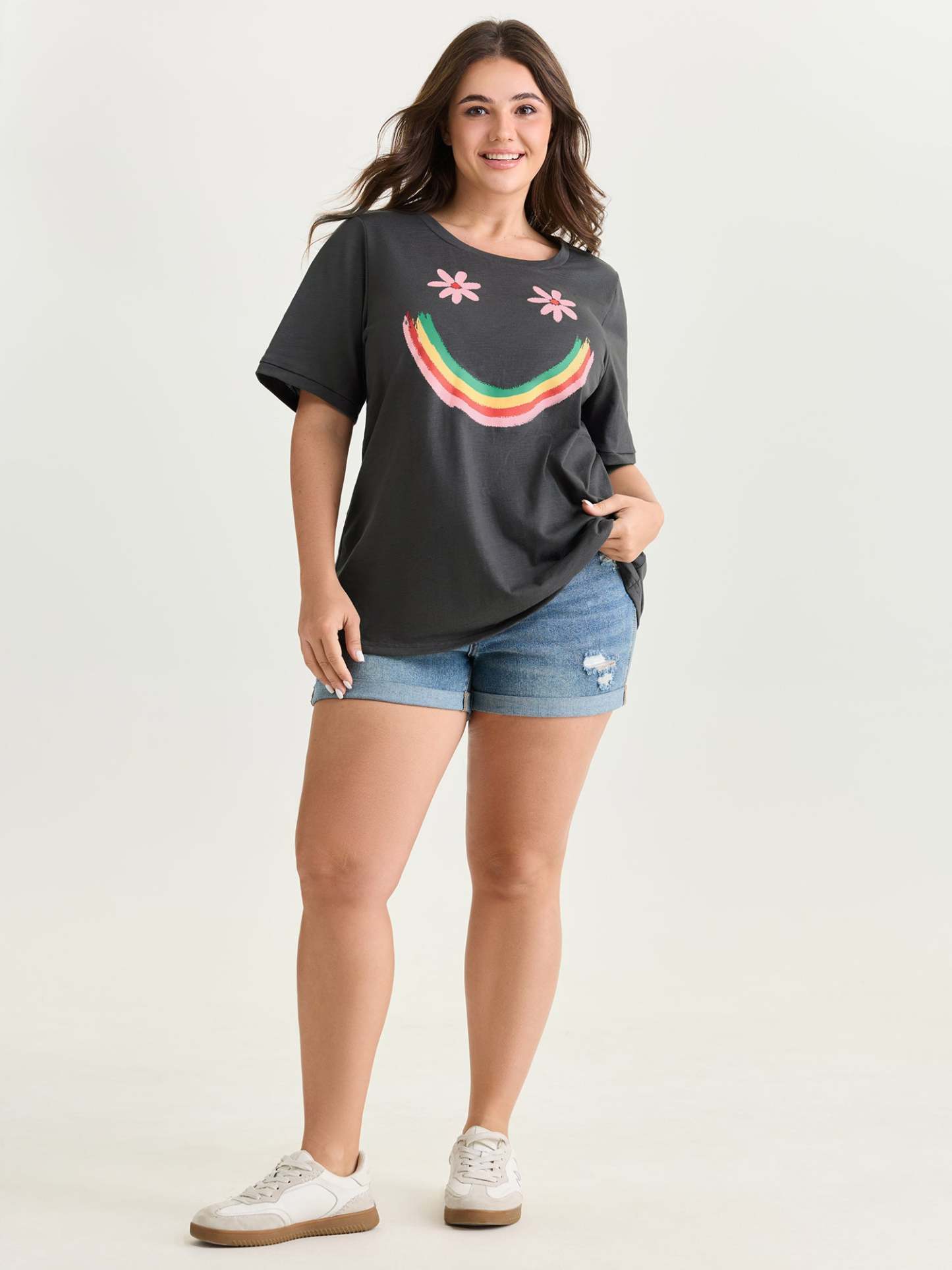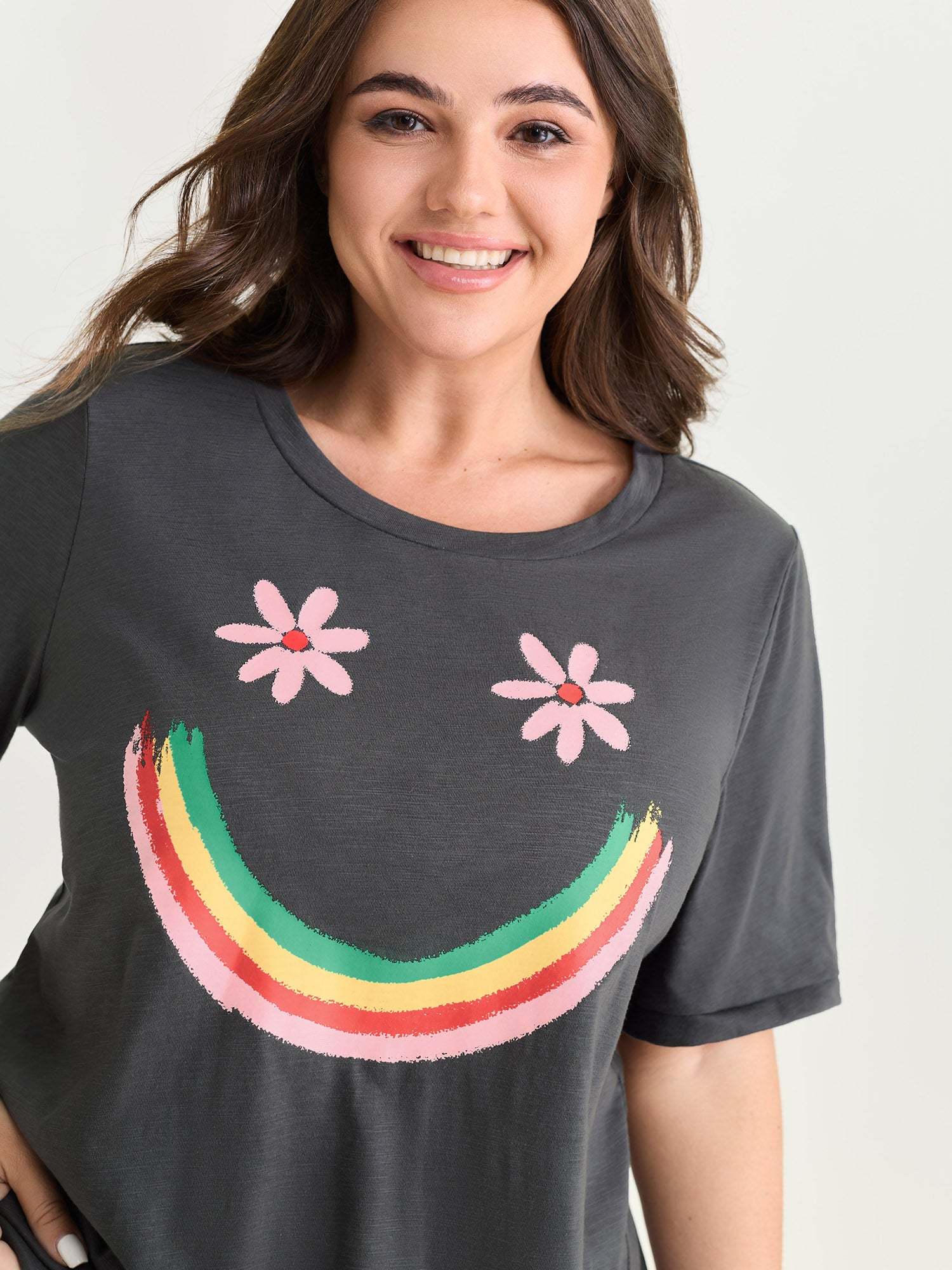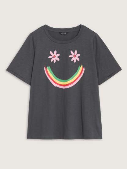 Shop Happy Rainbow Print Round Neck T-Shirt now and redefine your style with confidence at BloomChic. Tailored for mid and plus-size women. This trendy Tops Women, sizes 10-30. Color:Dim Gray;Style_2:Playful;Sleeve Type:Regular Sleeve;Pocket:No-pocket