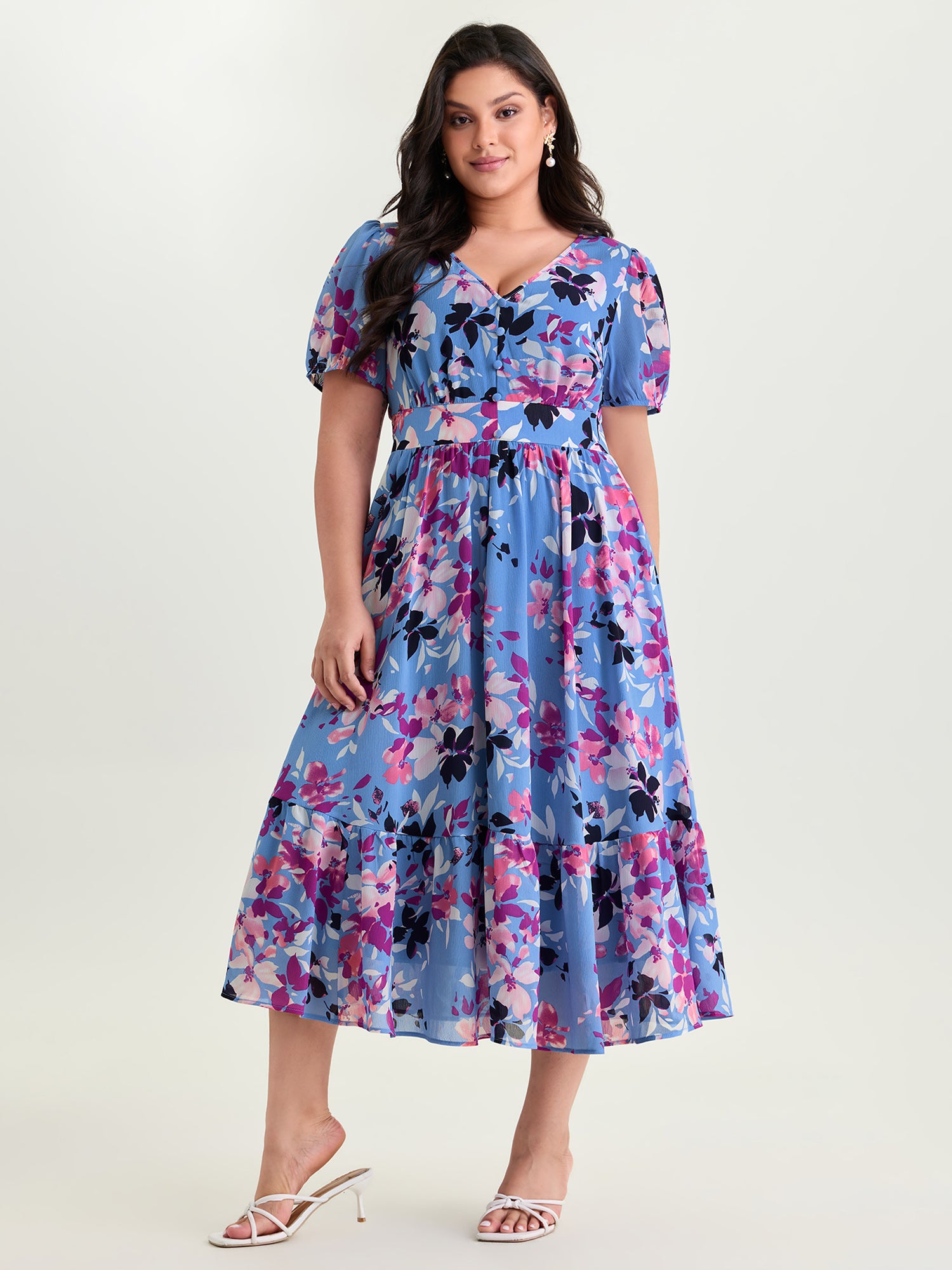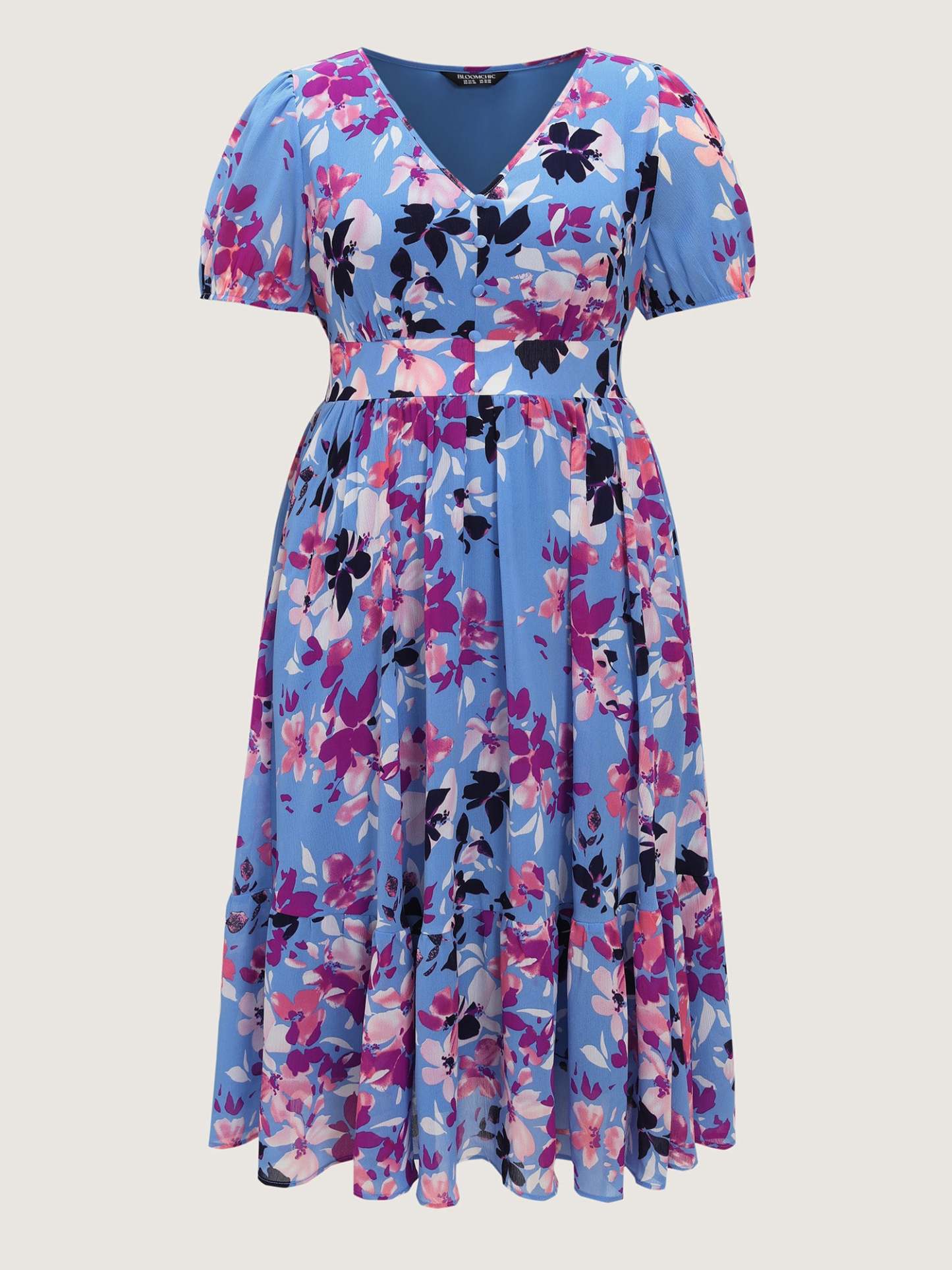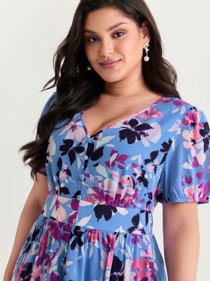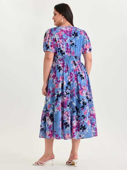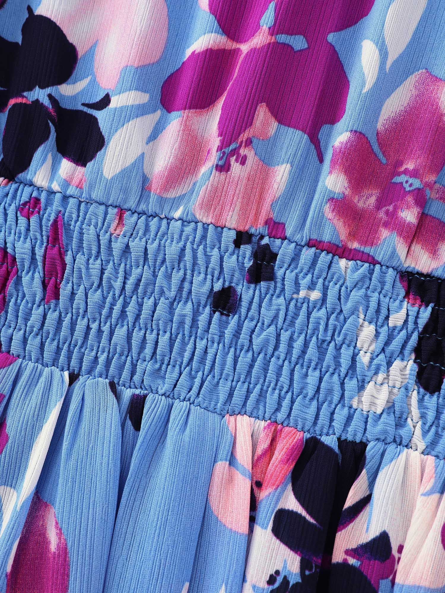 Shop Island-Ready Floral Print V-Neckline Maxi Dress now and redefine your style with confidence at BloomChic. Tailored for mid and plus-size women. This trendy Dress, sizes 10-30. You can never go wrong with BloomChic Dresses. Color:Blue Purple;Style_2:Romantic;Neckline:Deep V-neck;Sleeve Type:Lantern Sleeve;Pattern:Ditsy Floral;Details:Smocked;Pocket:Side seam pocket;Belt:No-belt;Closure Type:Button Closure