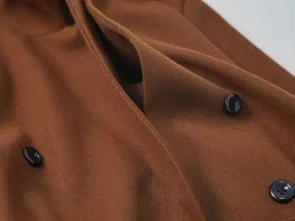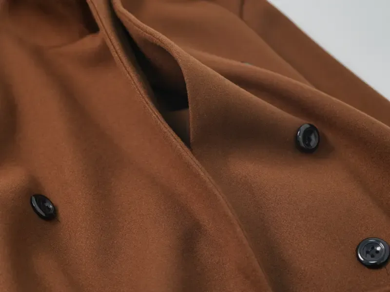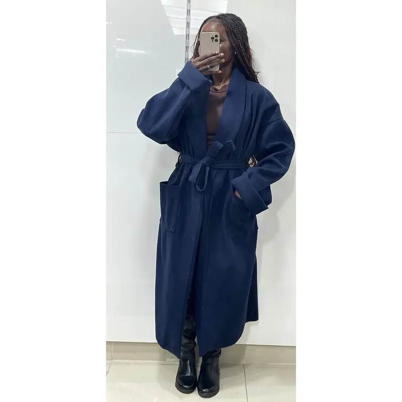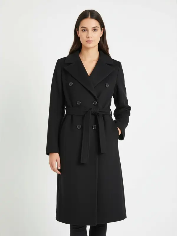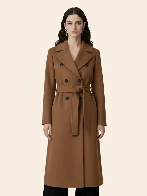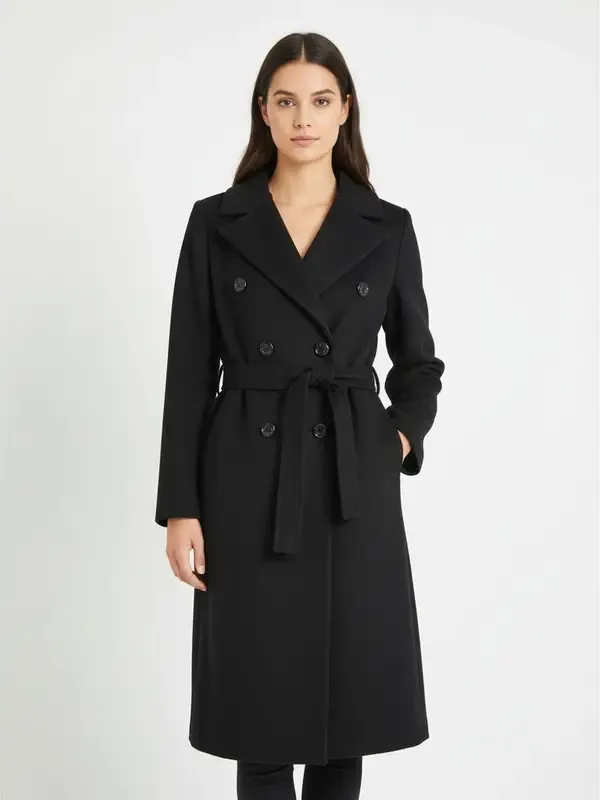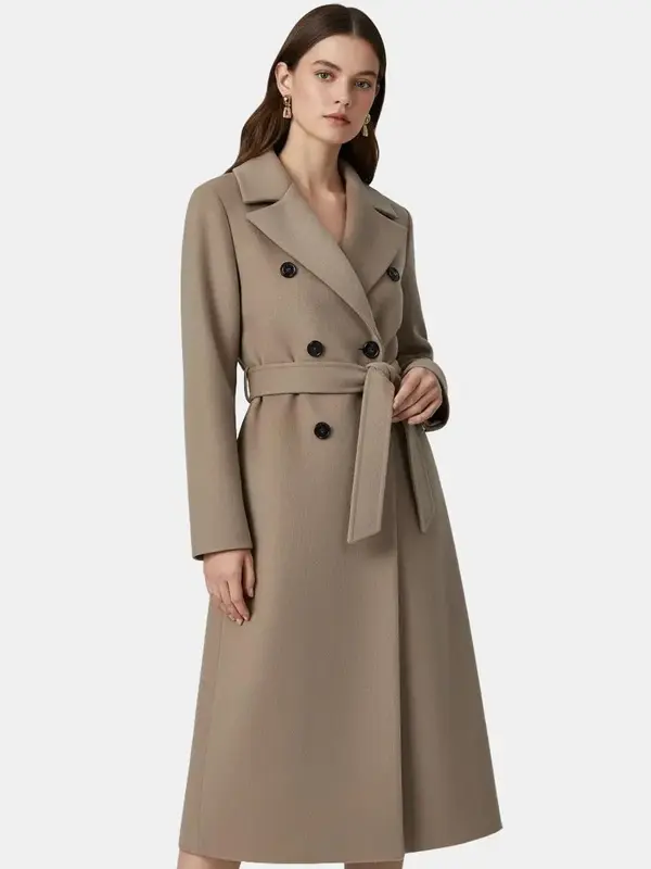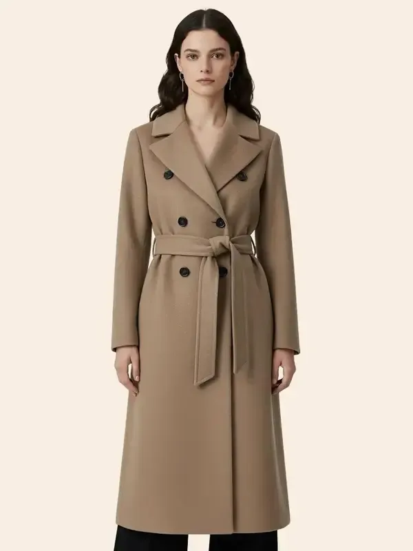 Long double-breasted coat with a belt and lapel, suitable for everyday wear and versatile