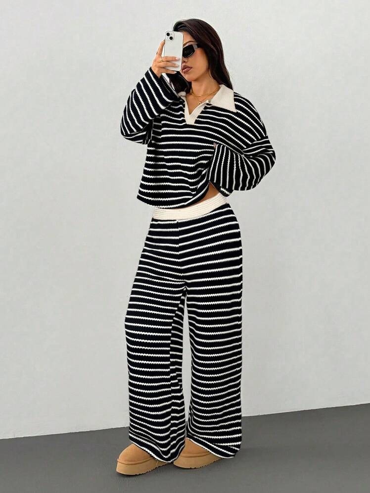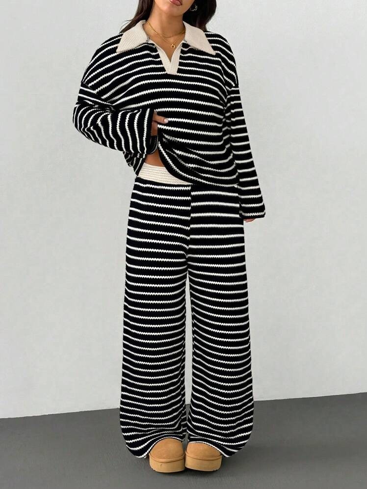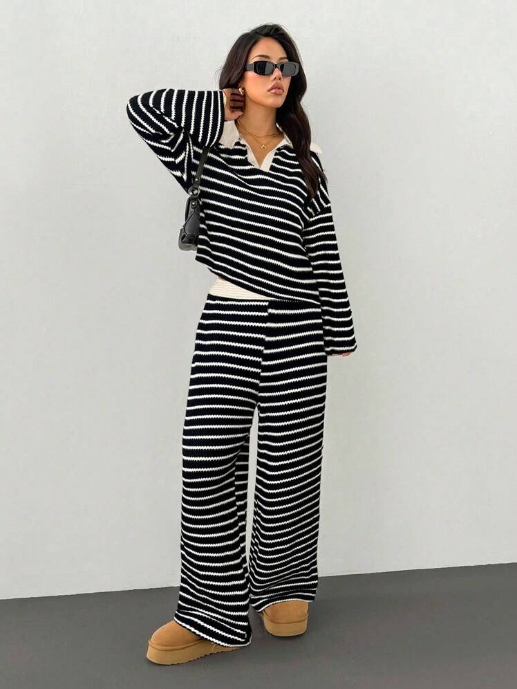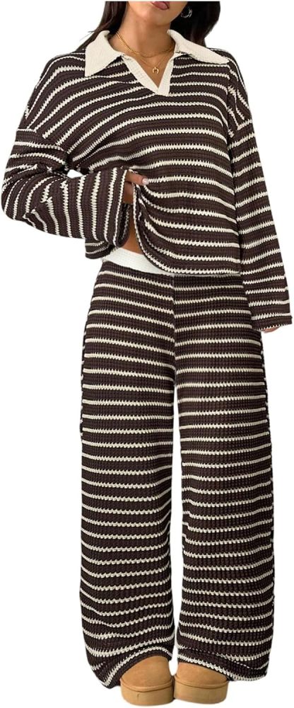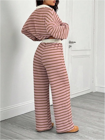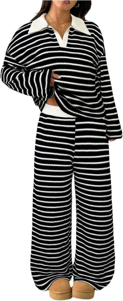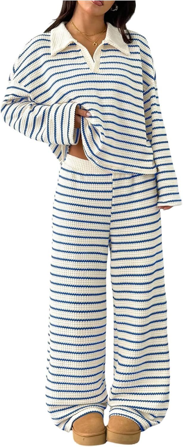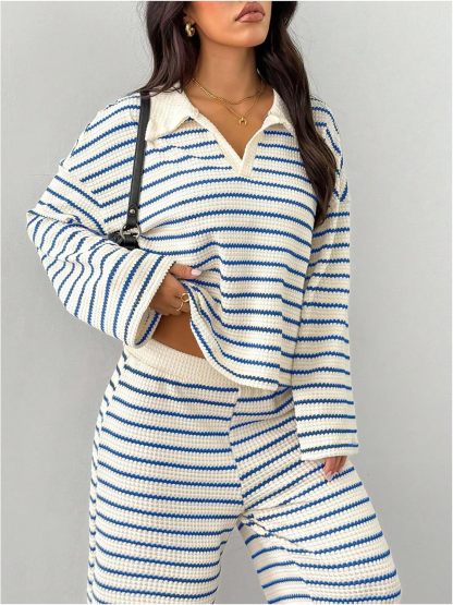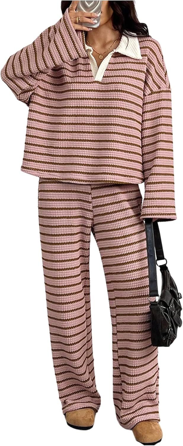 MakeMeChic Women's 2 Piece Sets Striped Long Sleeve Collared Tops Shirt Wide Leg Pants Matching Set