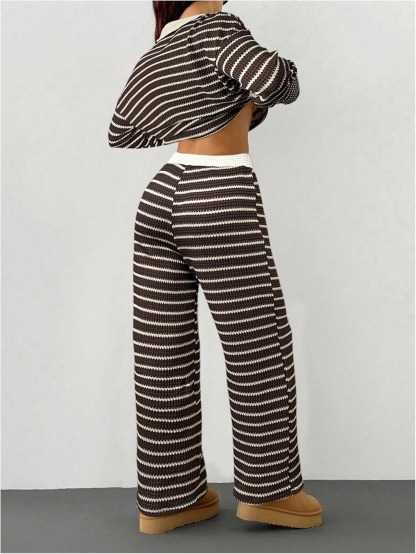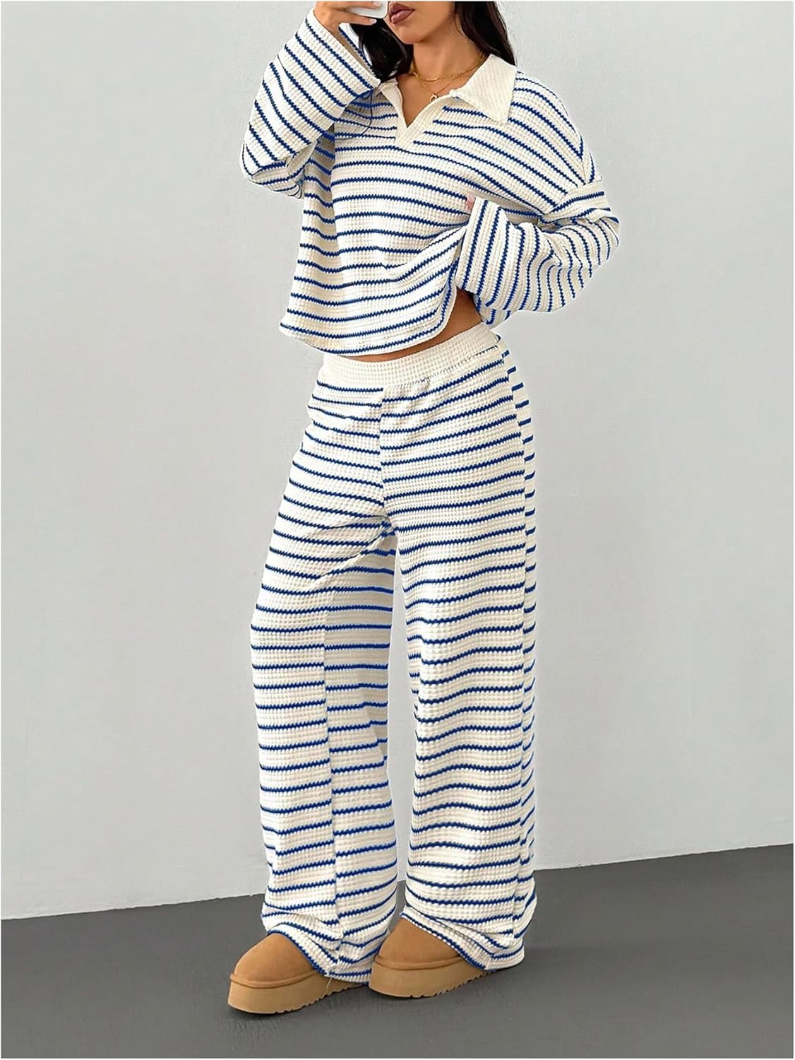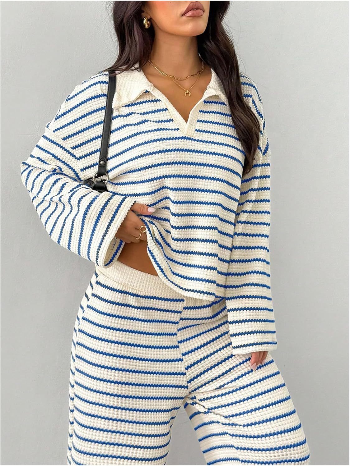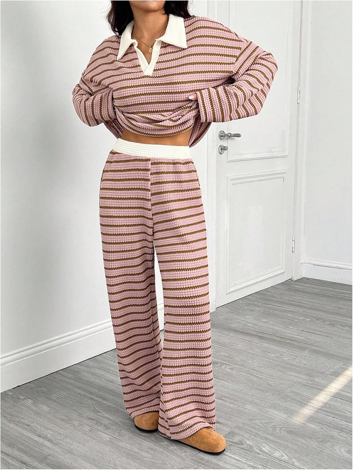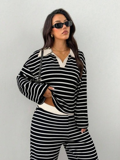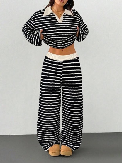MakeMeChic Women's 2 Piece Sets Striped Long Sleeve Collared Tops Shirt Wide Leg Pants Matching Set