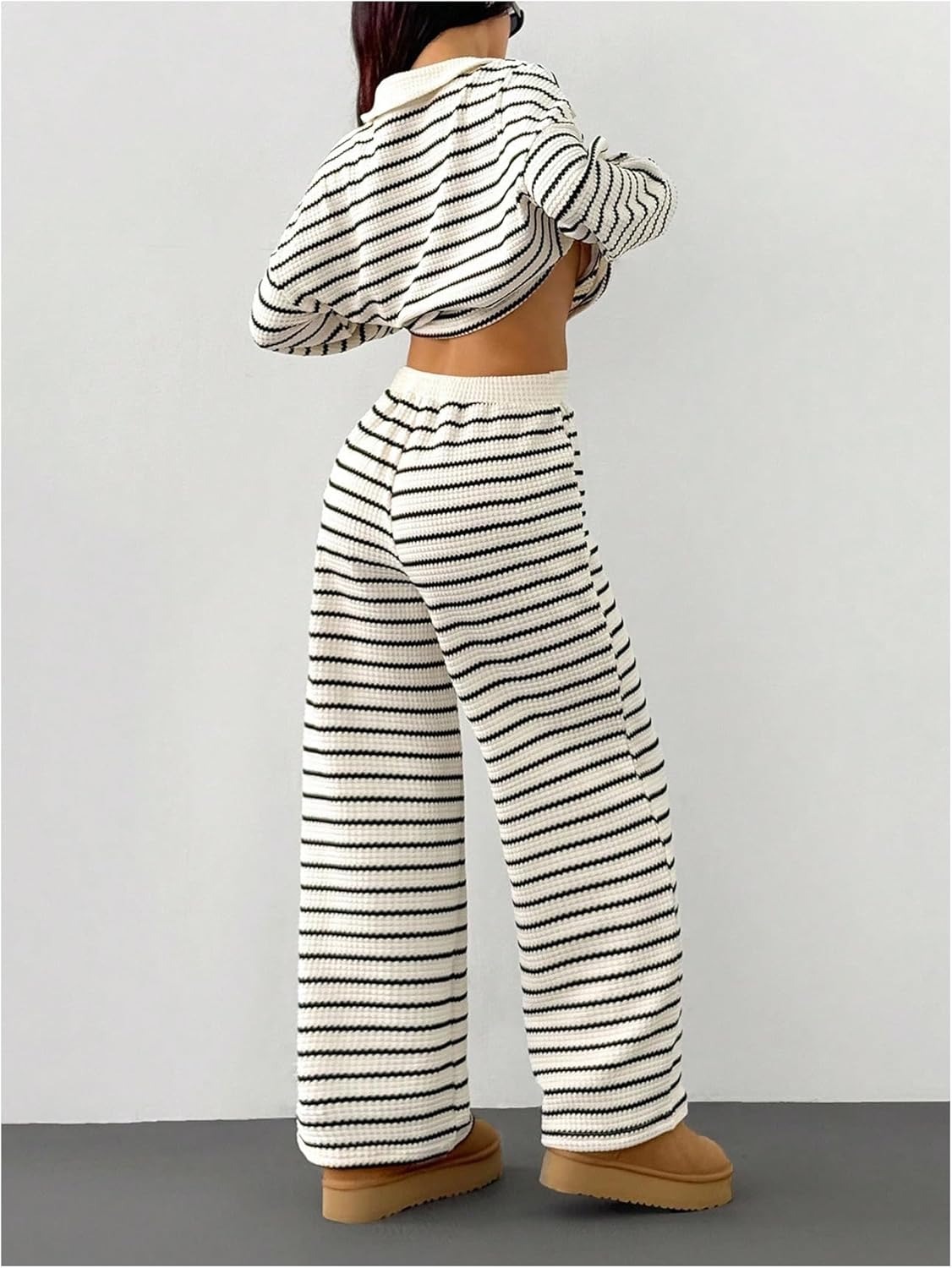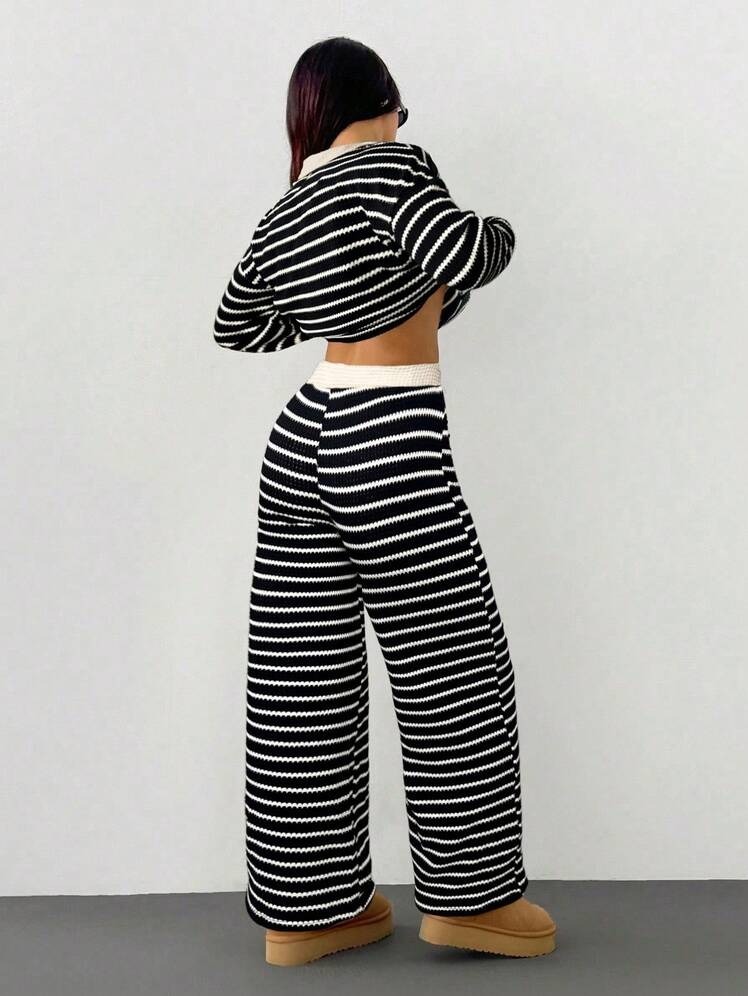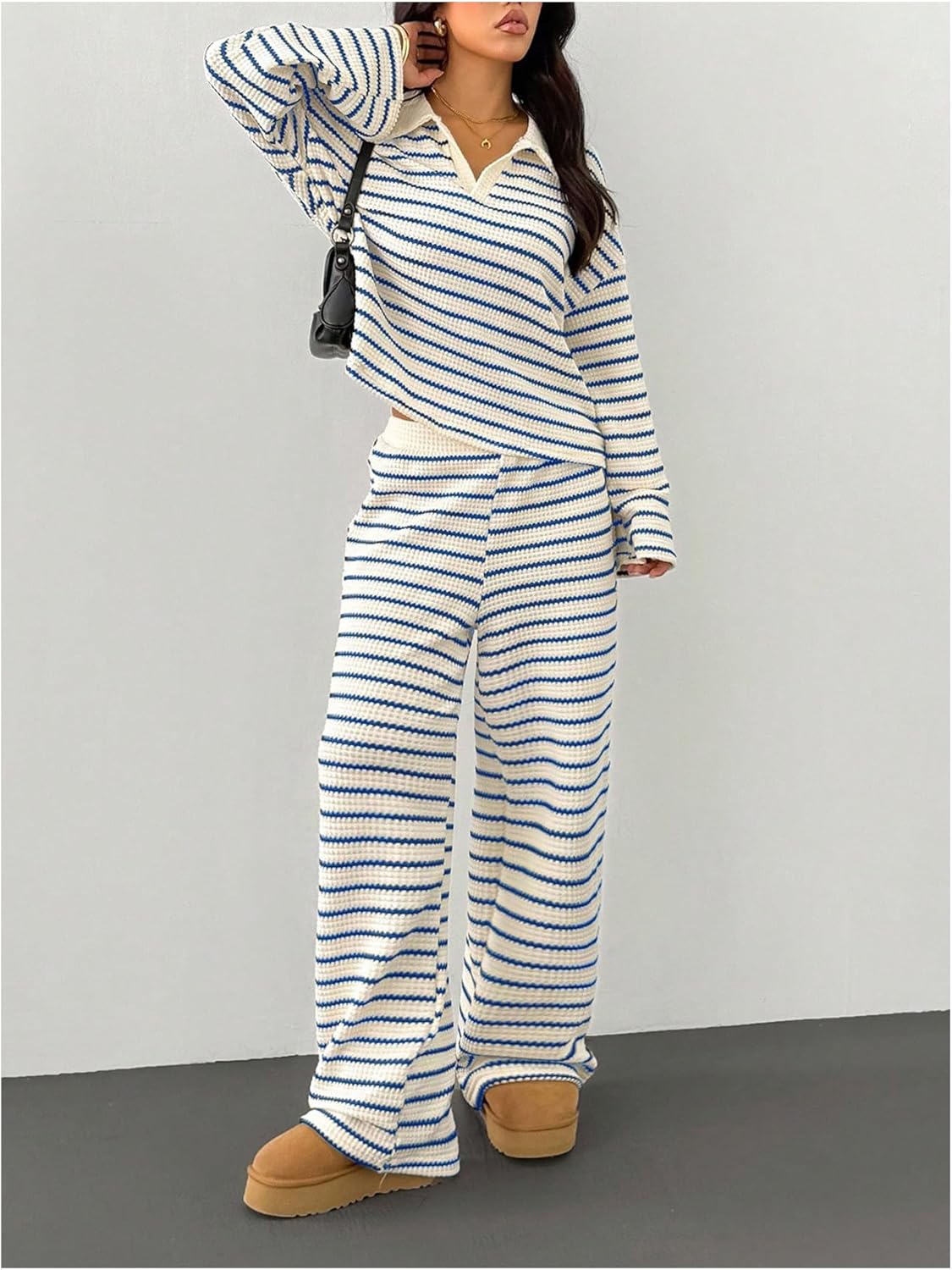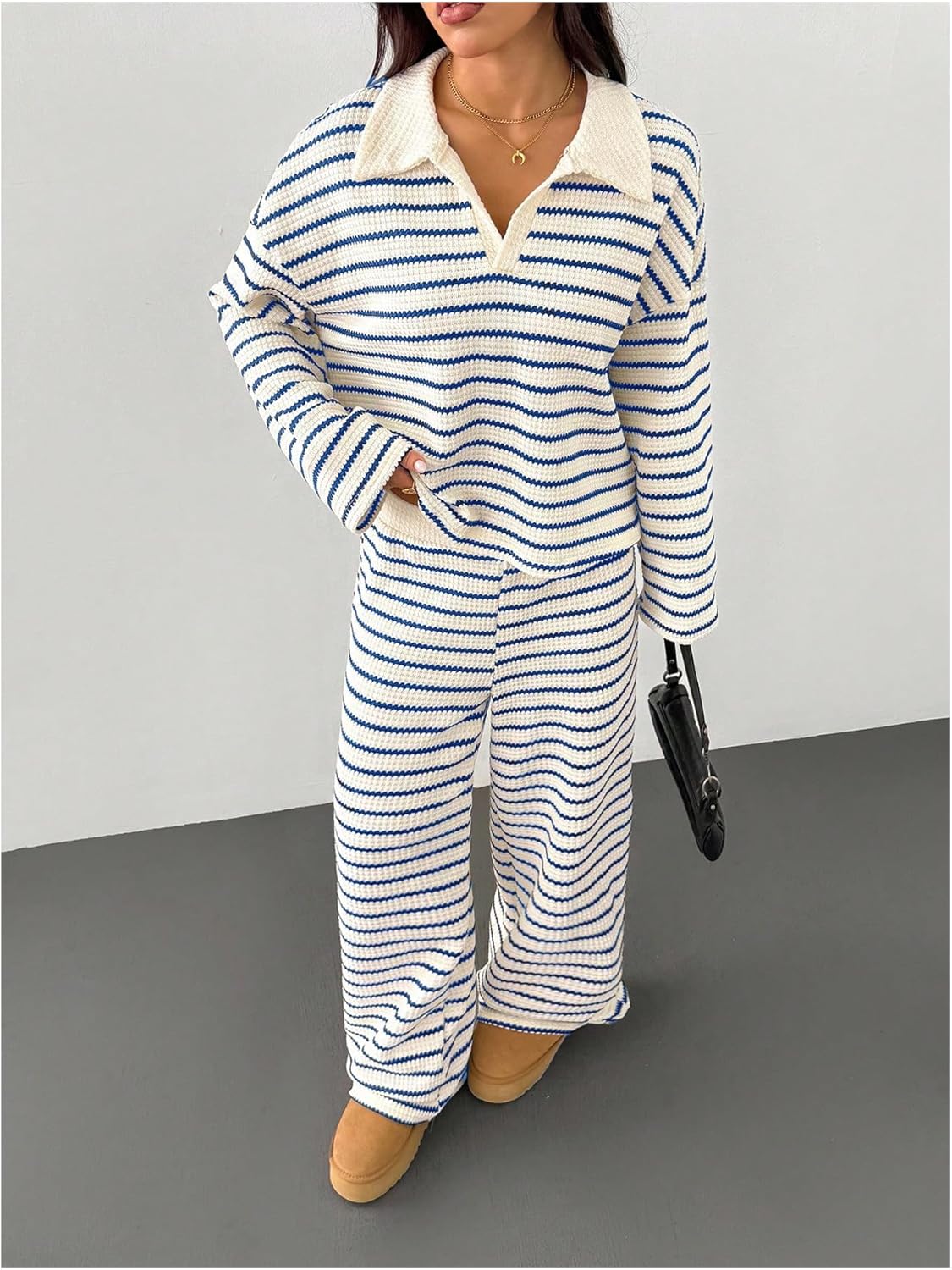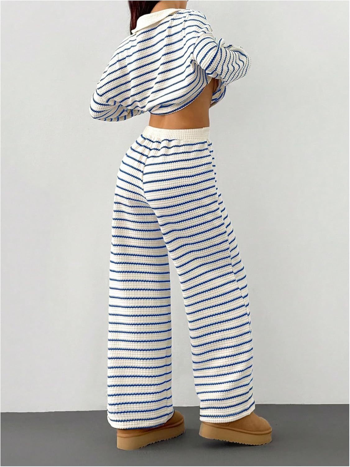 MakeMeChic Women's 2 Piece Sets Striped Long Sleeve Collared Tops Shirt Wide Leg Pants Matching Set