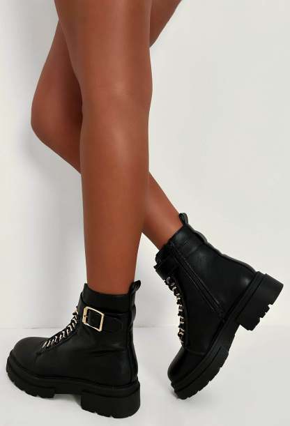 Unleash your inner rebel with our Never Settle Black Gold Buckle Biker Boots. These chunky lace-up boots feature gold details that add an edgy touch to any outfit!