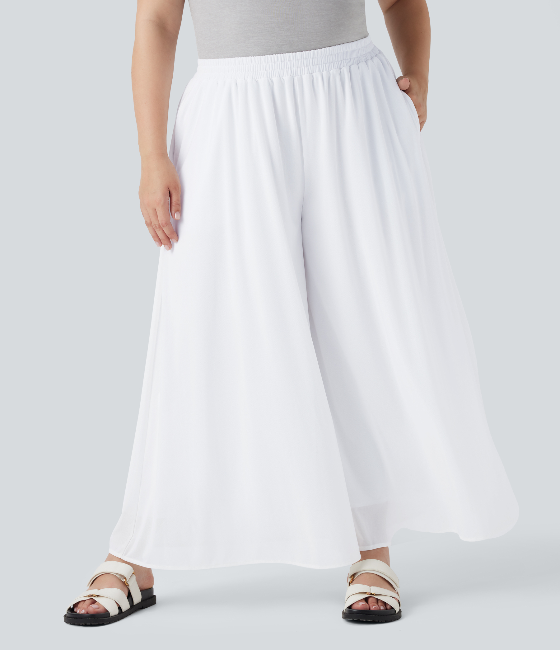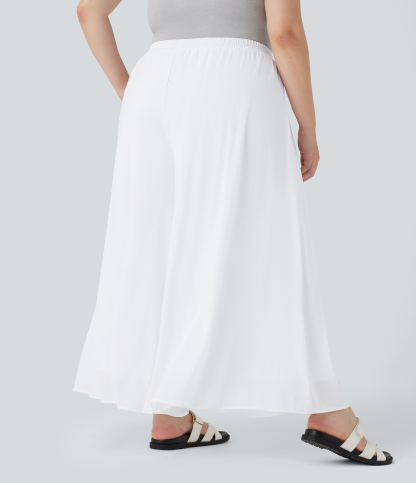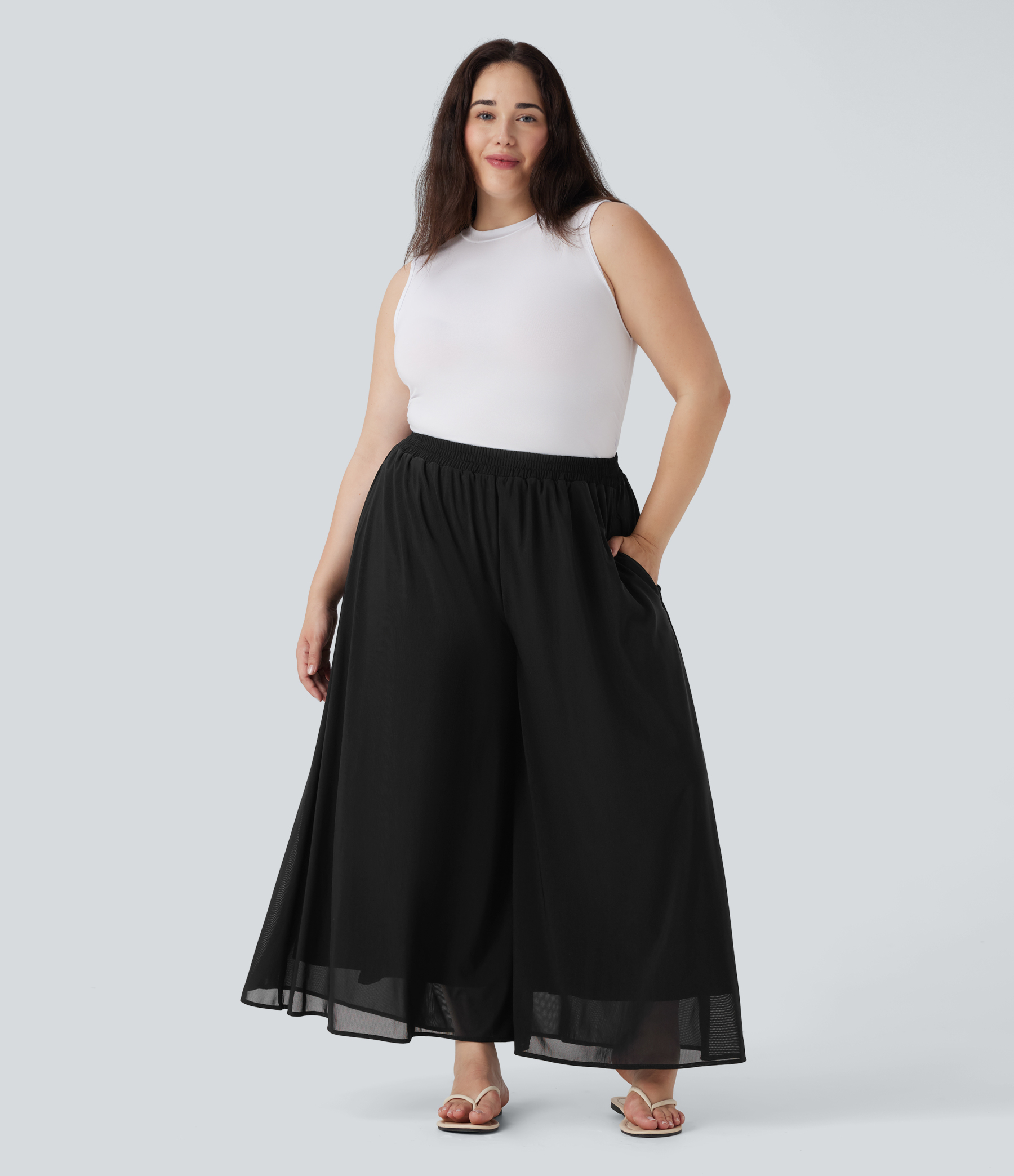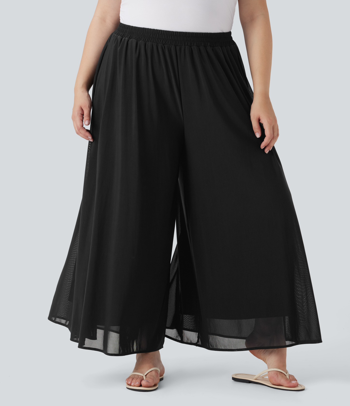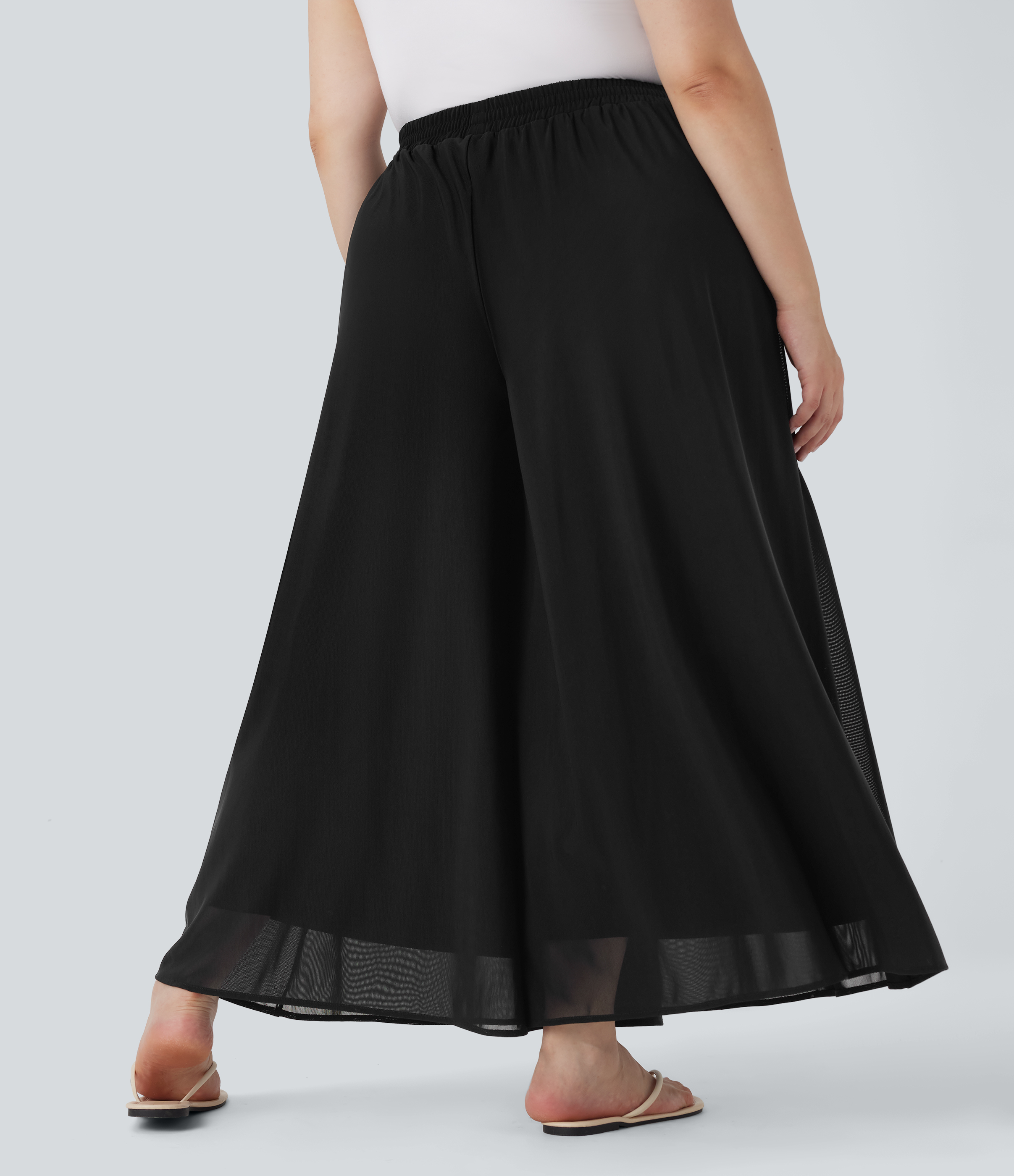 Plus Size High Waisted Mesh Overlay Wide Leg Casual Pants with Pockets