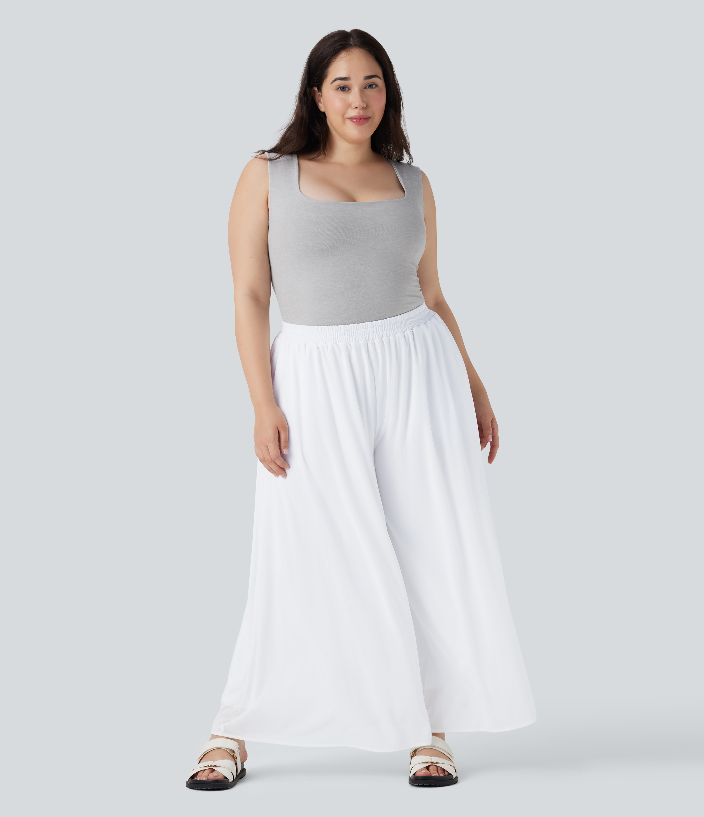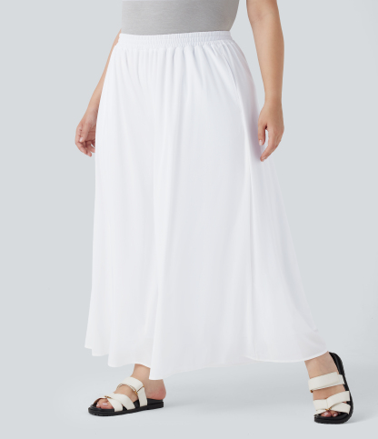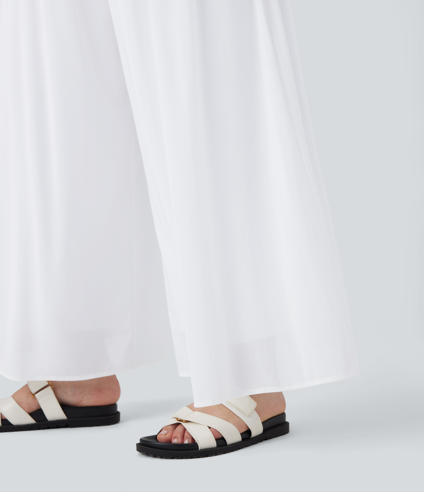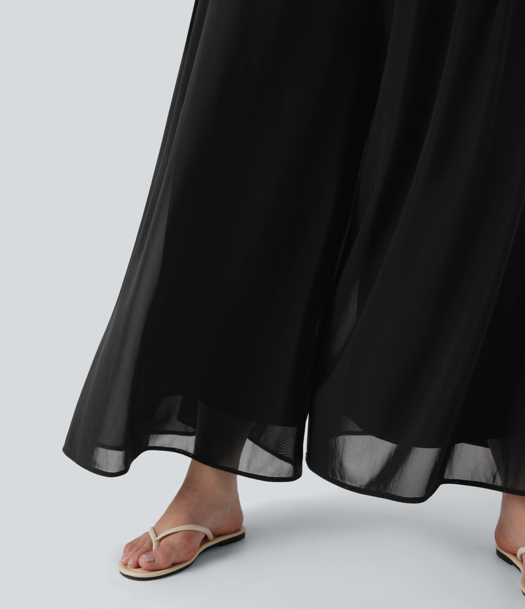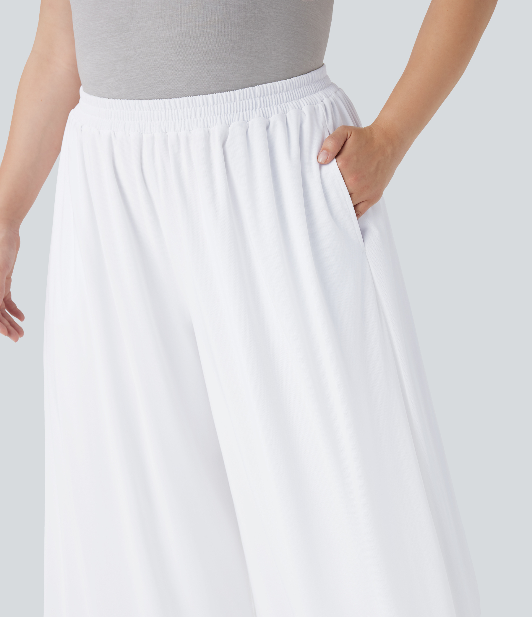 Plus Size High Waisted Mesh Overlay Wide Leg Casual Pants with Pockets