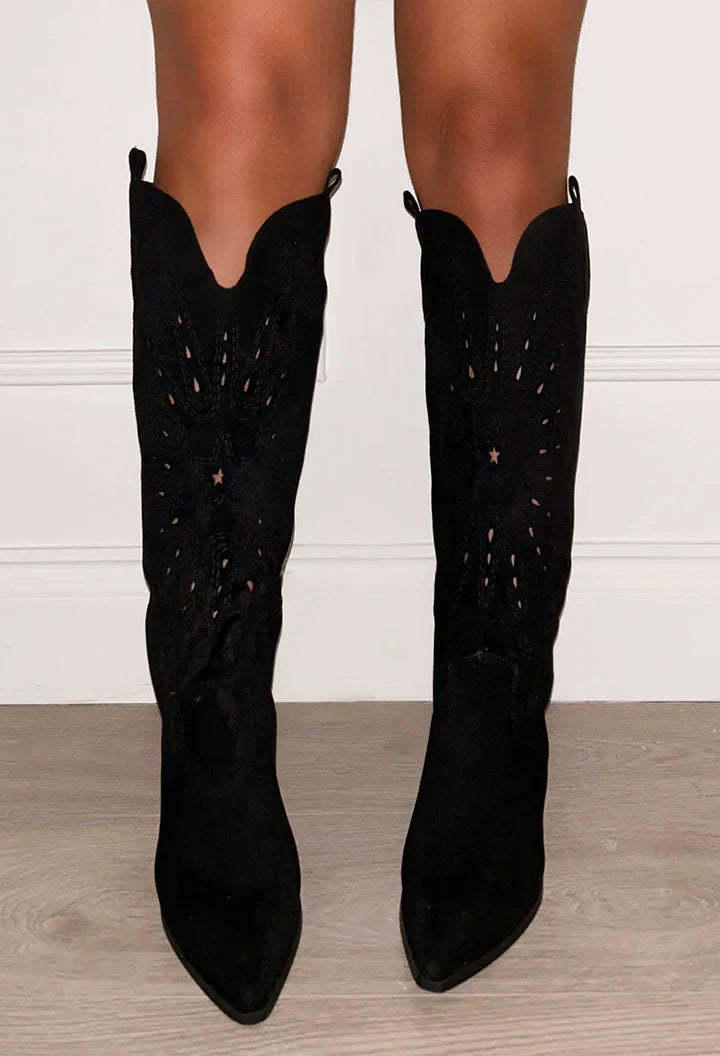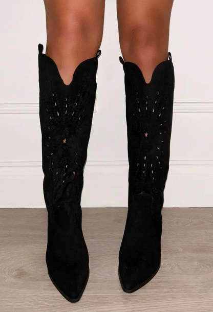Step into festival season with these black suede knee cowboy boots! Designed with block heels and a cushioned sole, these boots will have you looking and feeling your best!