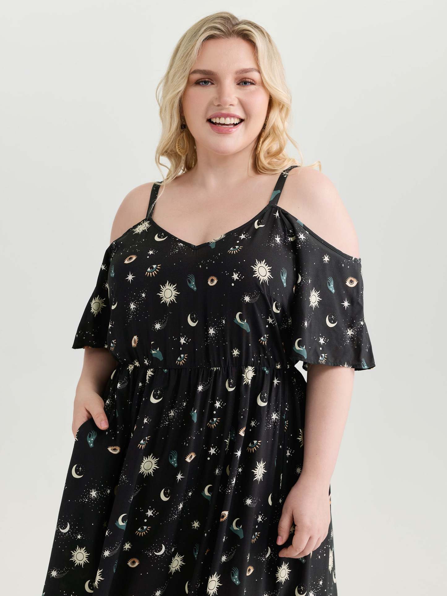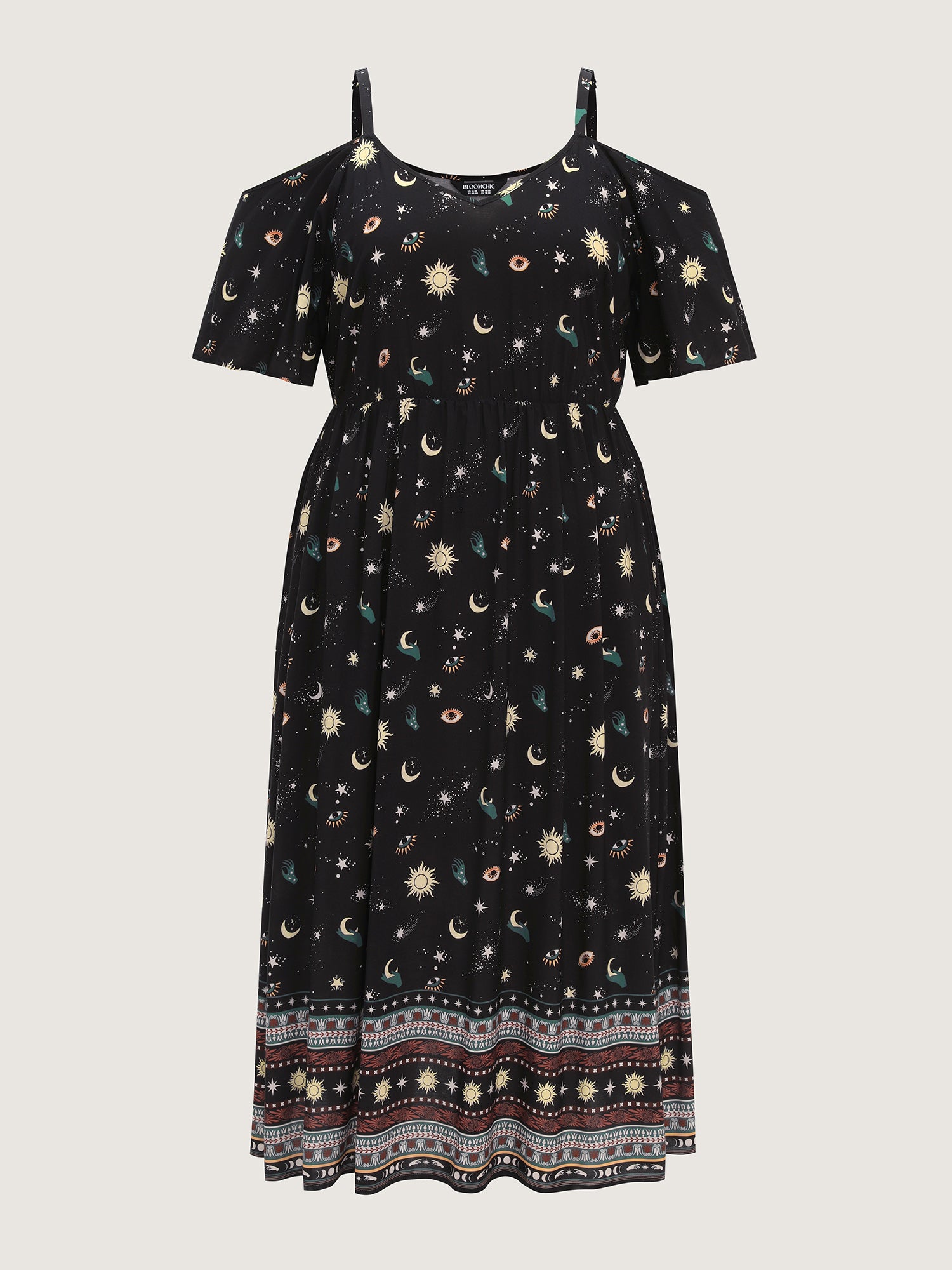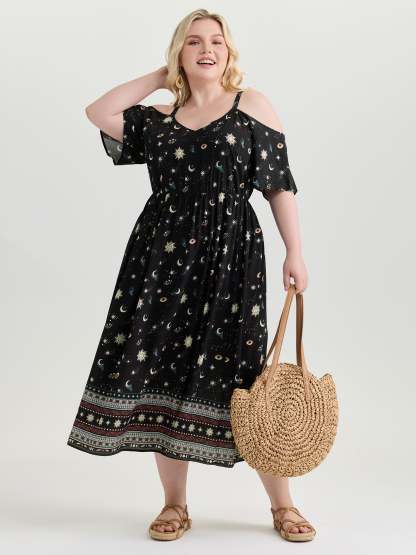 Shop Starry Night Cold-Shoulder Flowy Midi Dress now and redefine your style with confidence at BloomChic. Tailored for mid and plus-size women. This trendy Dress, sizes 10-30. You can never go wrong with BloomChic Dresses. Color:Black Flower;Style_2:Boho;Neckline:V-neck;Sleeve Type:Raglan sleeve;Pattern:定位花;Details:Non;Pocket:Side seam pocket;Snap Fastener:No-snap fastener;Belt:No-belt;Closure Type:Pull-On