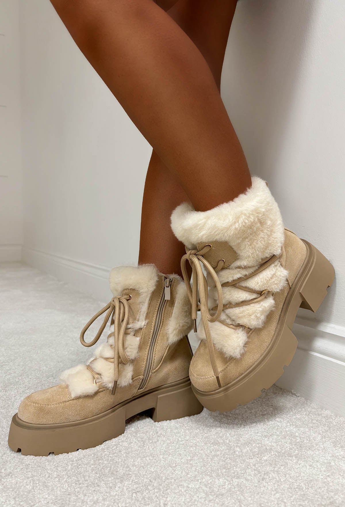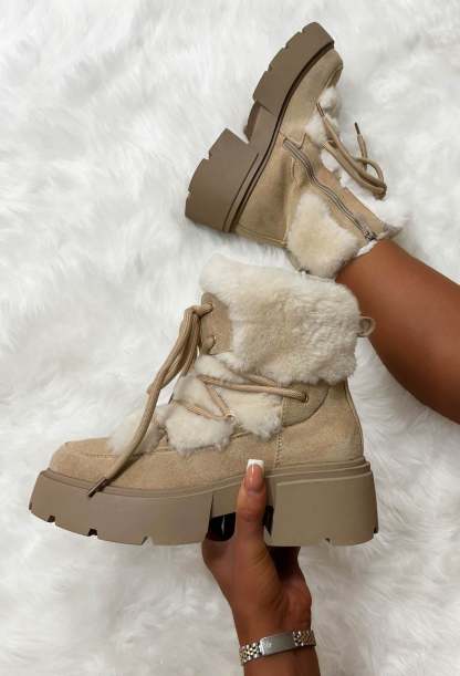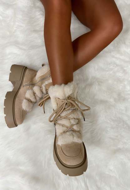 Step into style and comfort with our Take Your Chance Cream Faux Fur Lace Up Boots! In a faux suede, with a comfy chunky sole, these lace up boots come with a cosy faux fur lining that adds an extra touch of cosiness and luxury!