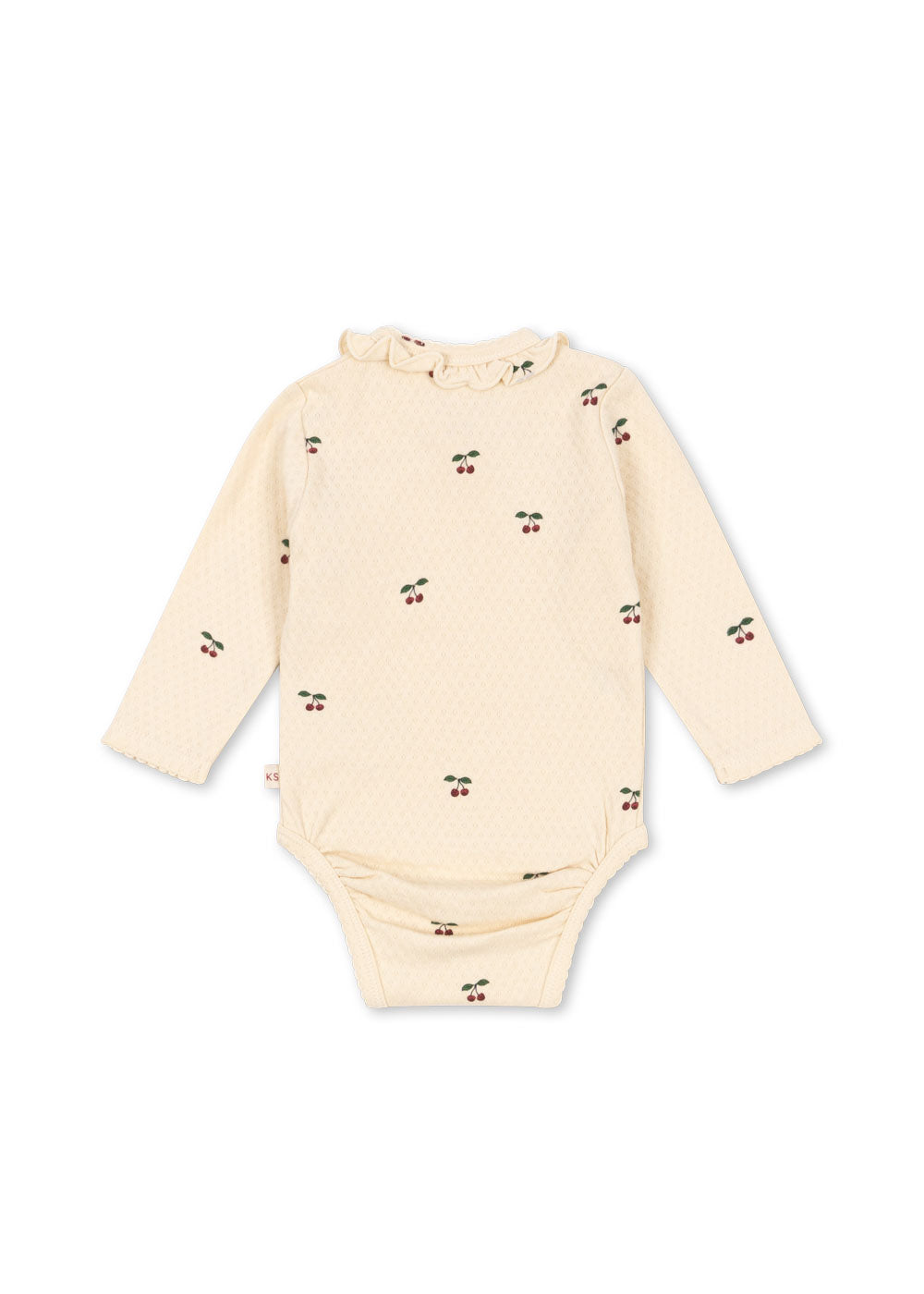 Soft cotton body for newborns with easy wrap closure and frill details. Snap button opening along the body and leg opening for easy dressing.