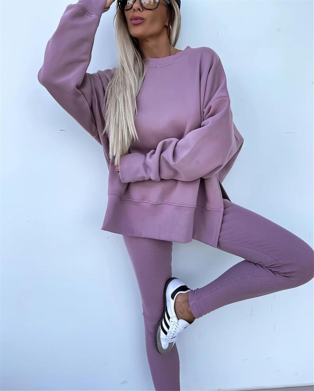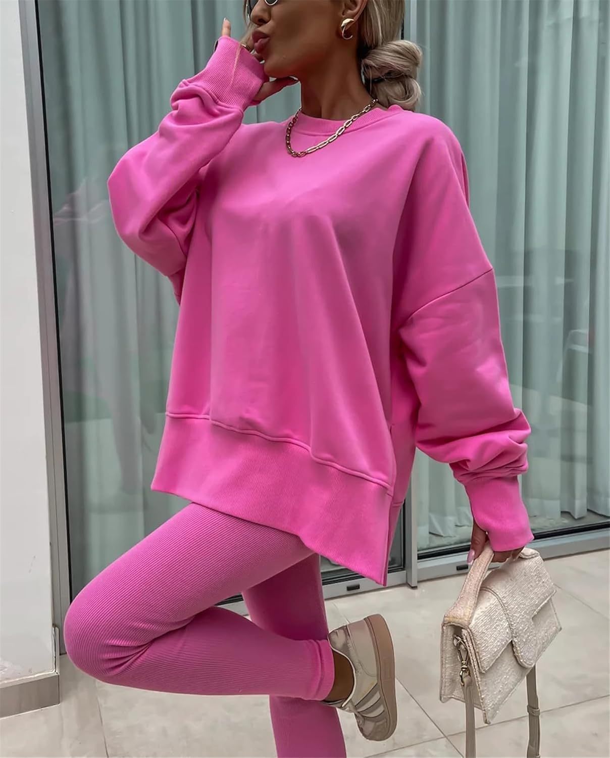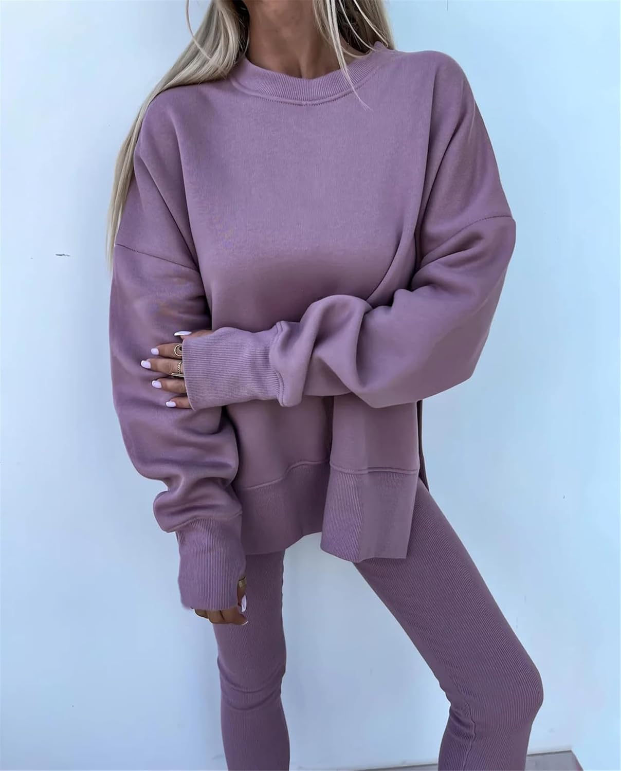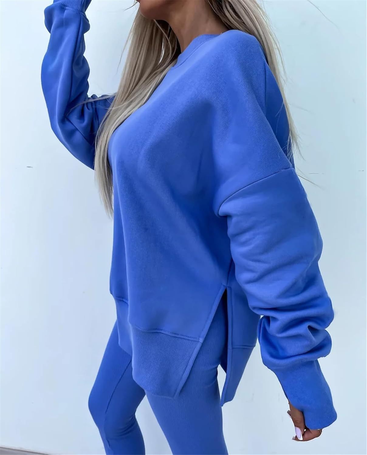 • Feature: Pants sets women 2 piece outfits, solid color set, long sleeve oversize sweatshirt with thumb hole, stretchy skinny pants, slim fit yoga outfit for women, streetwear style