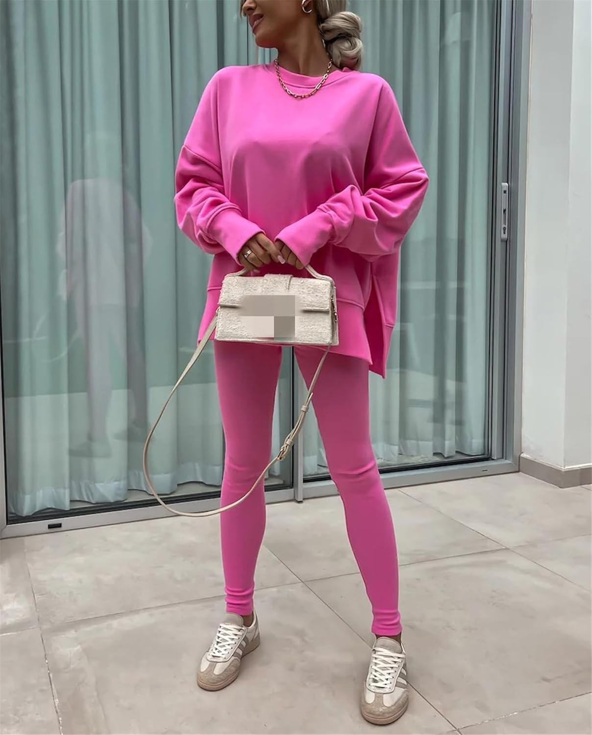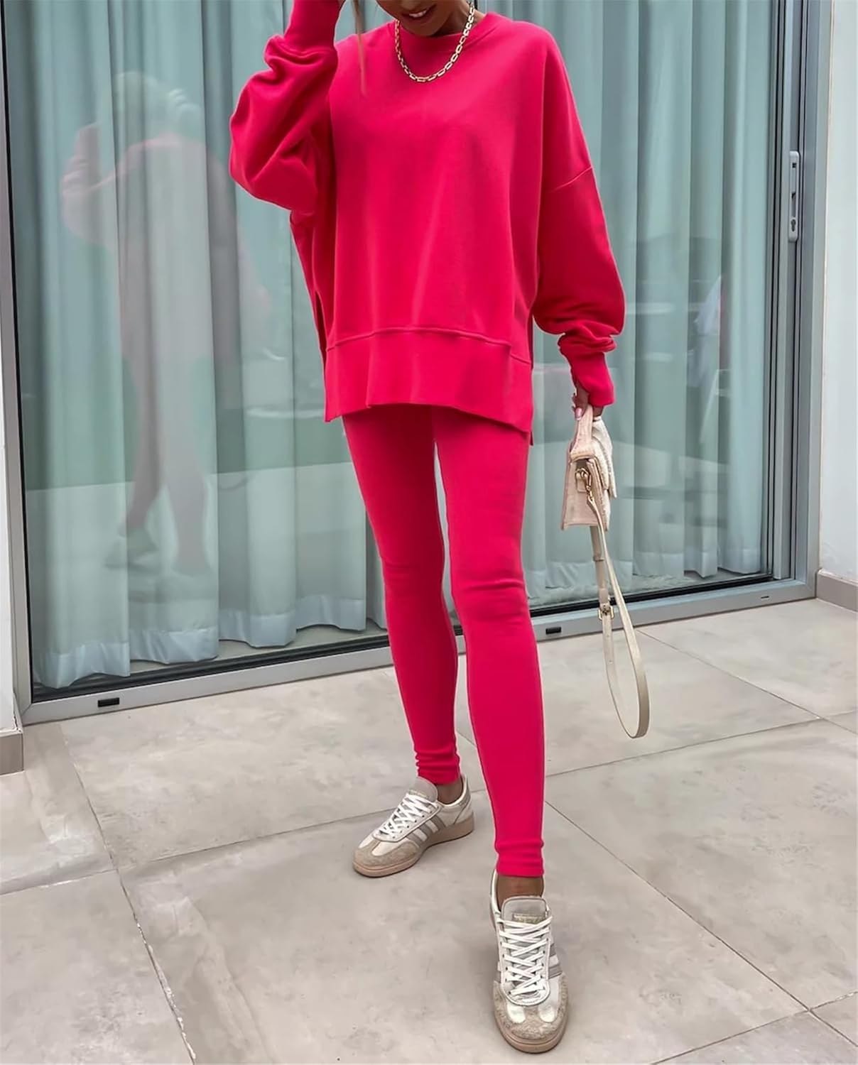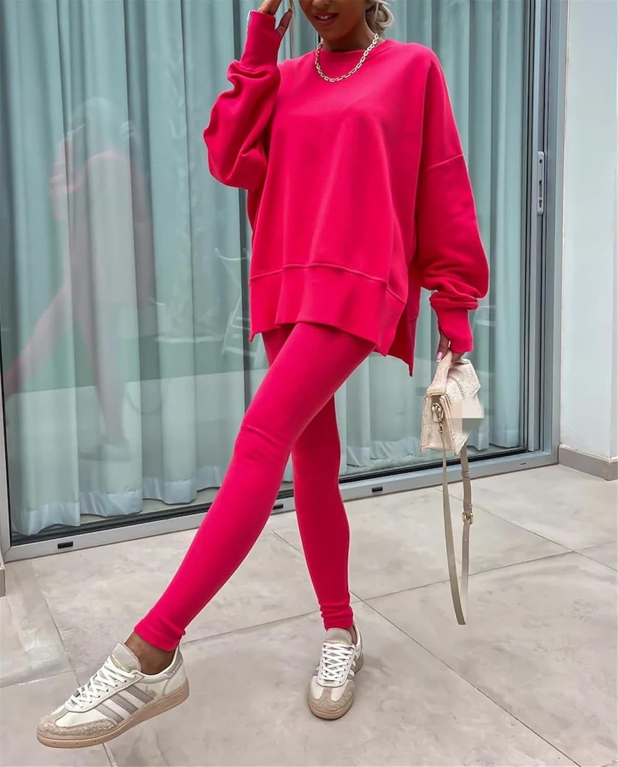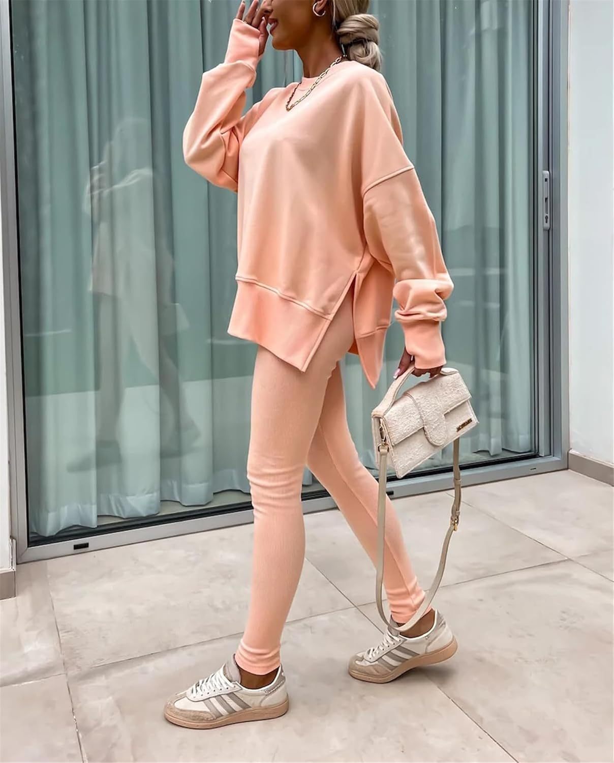 • Feature: Pants sets women 2 piece outfits, solid color set, long sleeve oversize sweatshirt with thumb hole, stretchy skinny pants, slim fit yoga outfit for women, streetwear style
