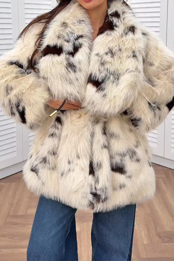 Women Cow Print Long Fur Large Lapel Plush Coat