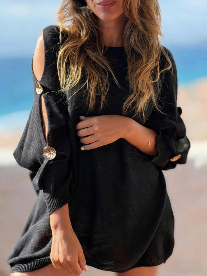 Women Round Neck Sleeves Hollowed Out Casual Top