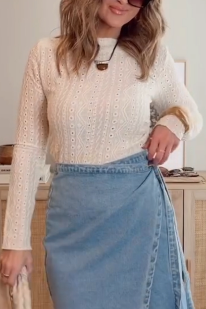 Women Round Neck Top+ Slit Denim Half Skirt Elegant Casual Set