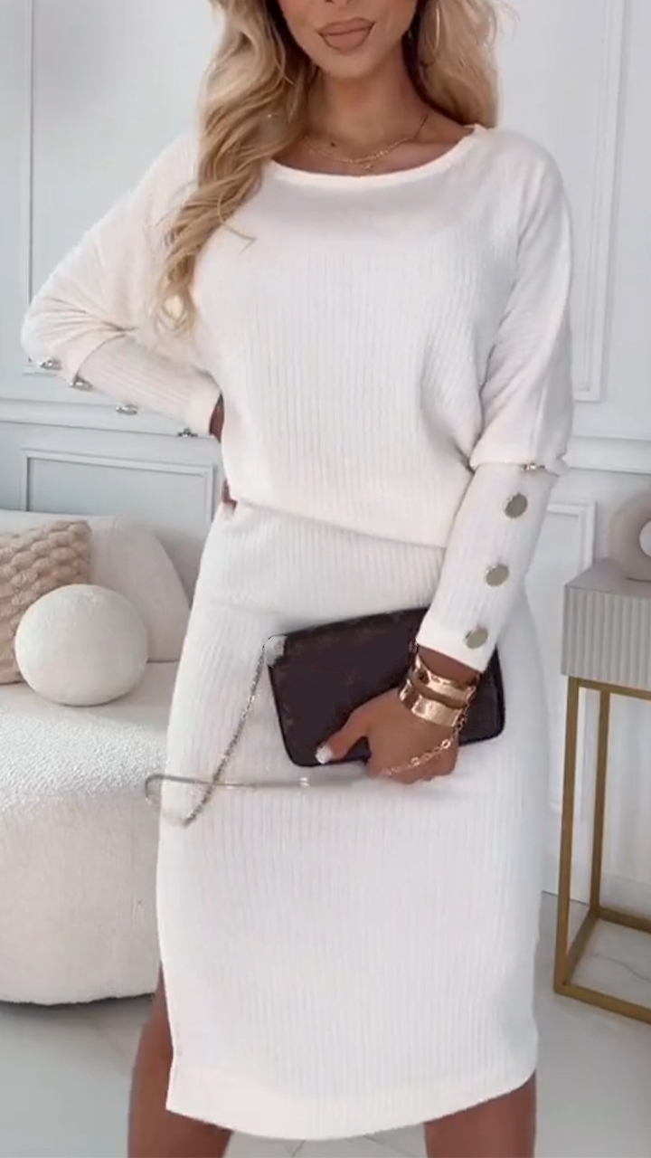 Women Round Neckline Button Decoration + Slit Skirt Casual Suit
