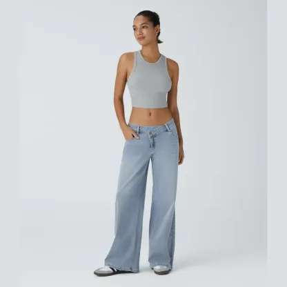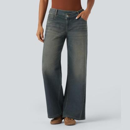 ·Features: Asymmetric design for an effortless look that is fun and stylish. Low waist design offers convenience & comfort. Button and zipper make it easy to put on and take off. Multiple pockets for easy storage. Wide leg style gives a timeless look, while providing comfortable wear. Four-way stretch fabric offers ease of movement and durable wearability. Breathable fabric made for both indoor and outdoor activities to keep you comfortable for movement. Materials ·69.8% cotton, 25.5% polyester and 4.7% elastane Care Tips for Long-Lasting Jeans ·Reduce Friction Avoid contact with rough surfaces and wash inside out.·Gentle Washing Wash in cold water (by hand or machine) with a gentle detergent, and use a laundry bag.·Avoid High Temperatures No tumble drying or direct sun exposure.·Proper Storage Fold carefully for moisture-proof storage.·Recommends to wash before wearing.·Slight fading is normal in the first wash.·By following these care tips, your jeans will stay elastic and look great for longer, with fewer issues with threads!