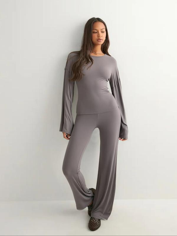 Women's Fall New Round Neck Flare Long Sleeve Top & Elastic Waist Straight Leg Pants Set, Casual Fashion for Daily Wear