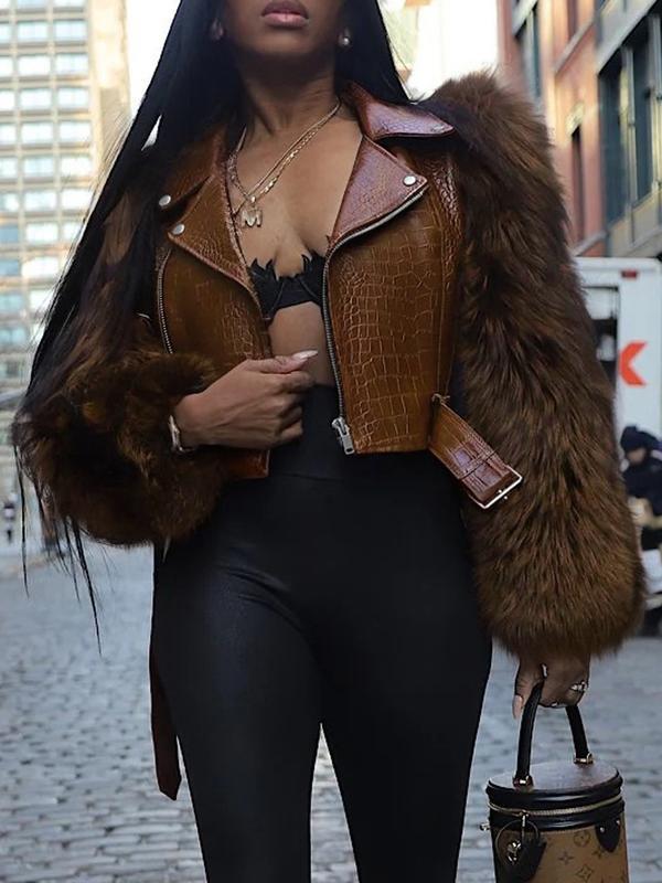 Women's Patchwork Fur Jacket, Crocodile Texture Sleeves, Zipper Design, Casual Biker Style, All Seasons Wear, Stylish & Luxurious Look