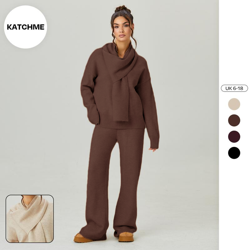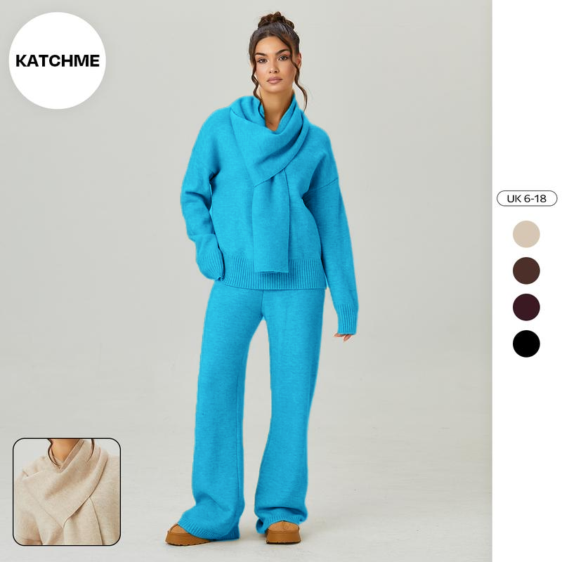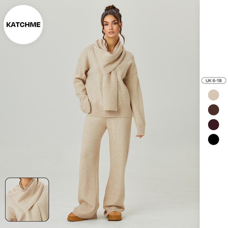 Women's Slouchy Solid Color V-Neck Long Sleeve Sweater with Scarf & Wide Leg Trousers Co-ord, Cozy Fall & Winter Outfits, Ladies' Knit Clothing