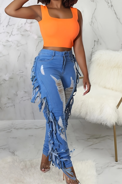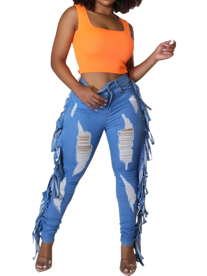 Womens Spliced ​​tassel Scratch Casual Jeans