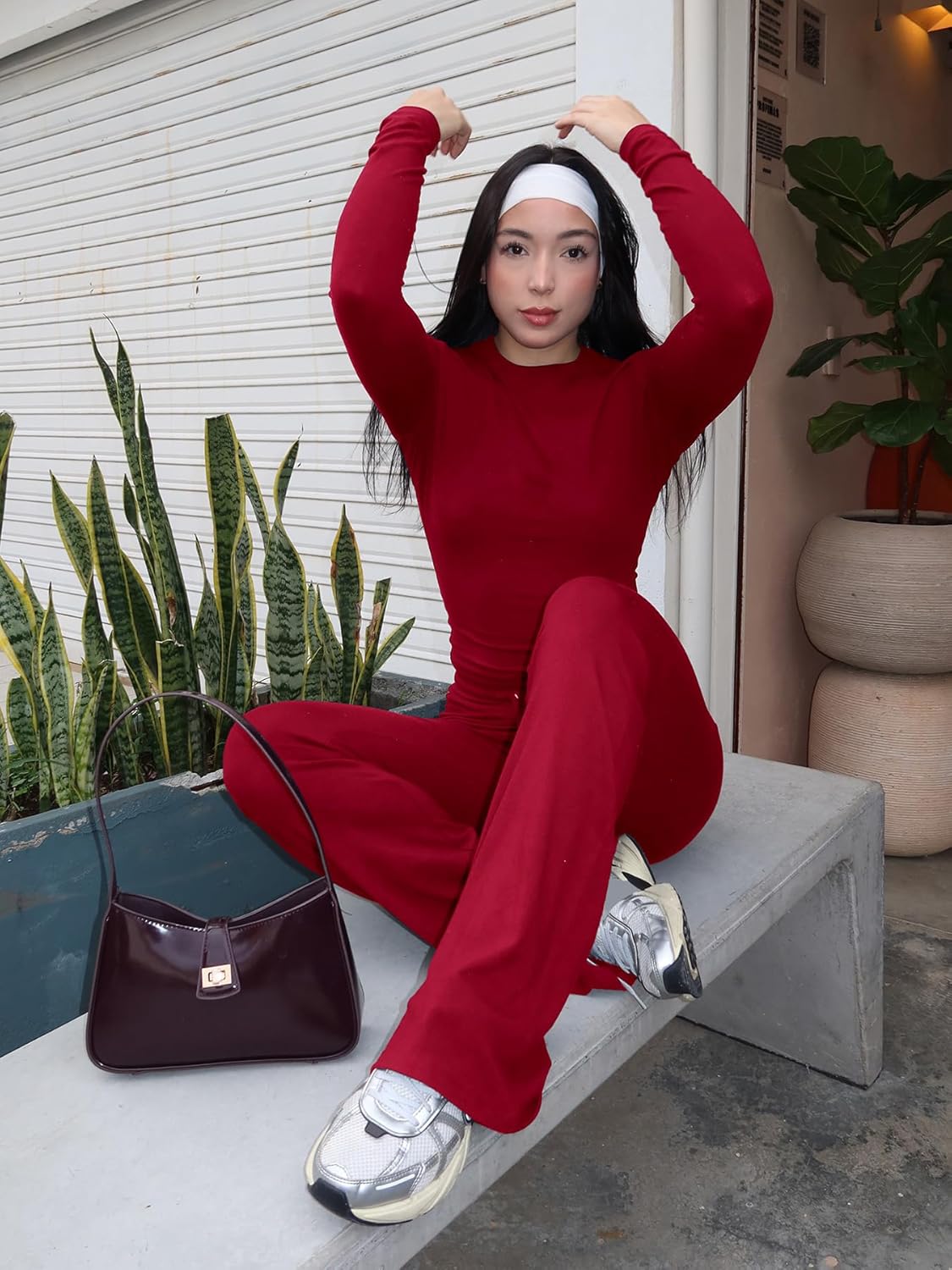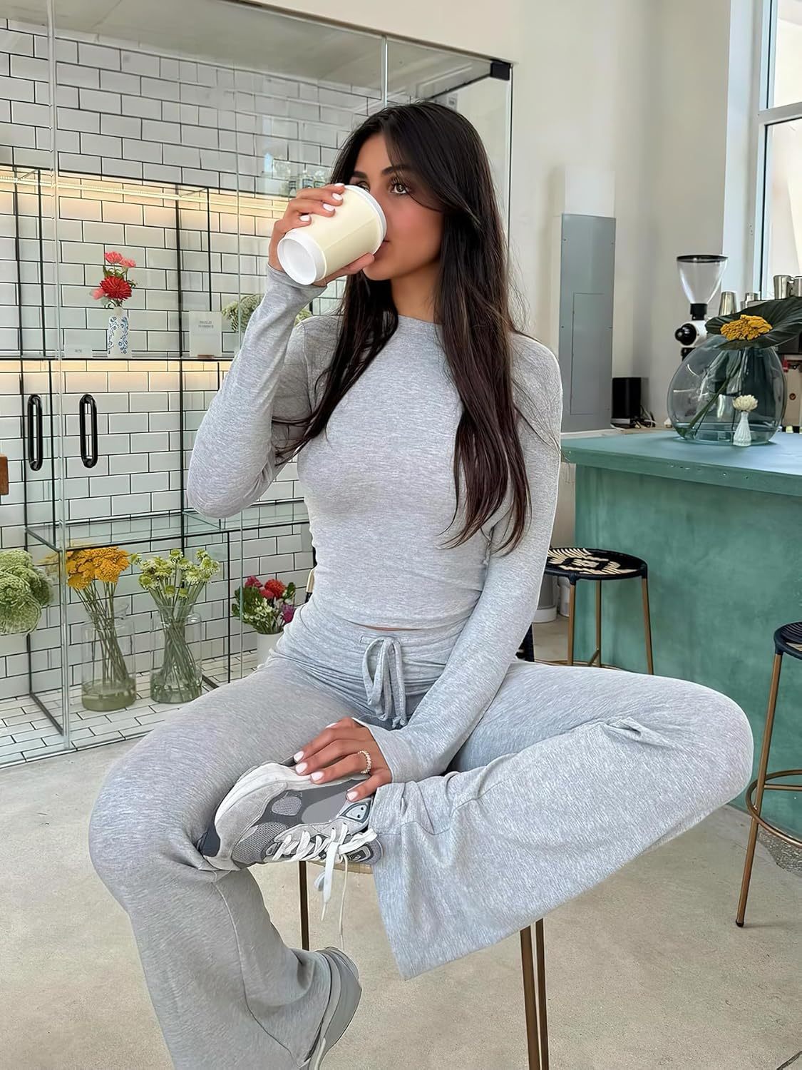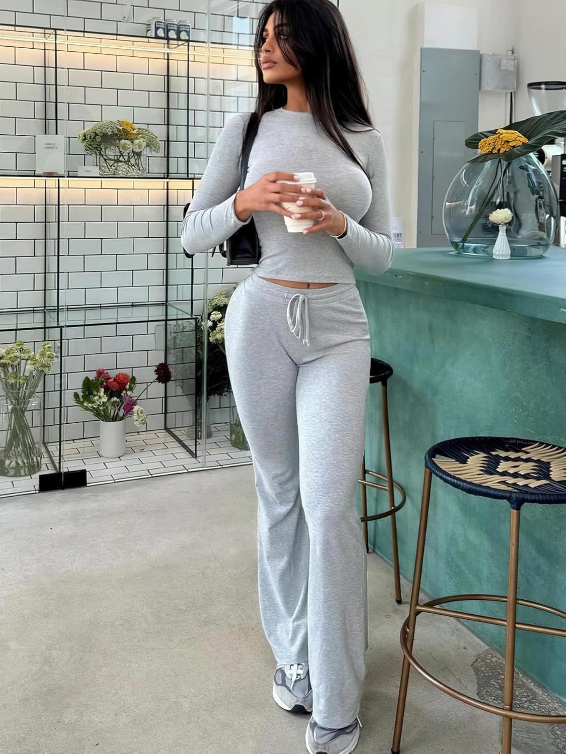 YEOREO Two Piece Sets for Women Long Sleeve Tops Lounge Set Drawstring Wide Leg Pants Ava Matching