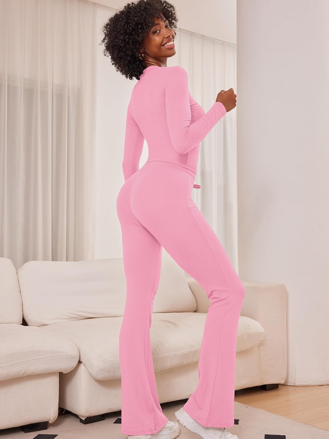 • Stylish Wide Leg Pants: The pants have a flattering bell-bottom cut, adding a touch of vintage style to your loungewear